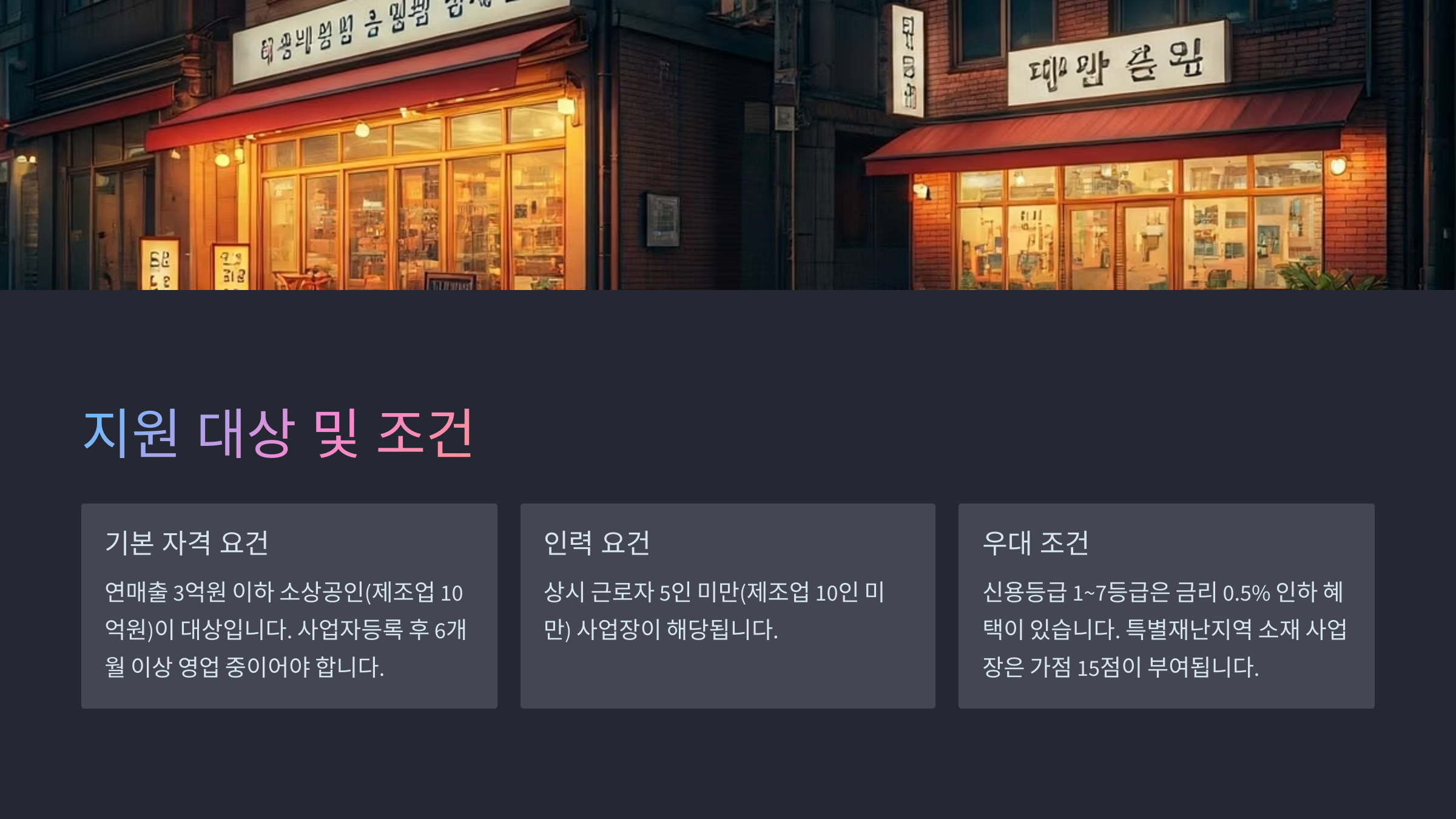 | 기존 소상공인 | 사업자 등록 3개월 이상, 연 매출 10억 이하 | 업종 제한 있음 |