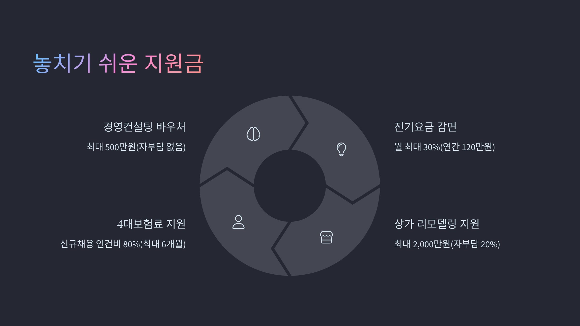 단순한 현금지급 외에도 컨설팅, 마케팅 지원, 온라인 쇼핑몰 입점 지원, 점포 리모델링 비용 등 실질적으로 도움이 되는 프로그램들이 많아요.