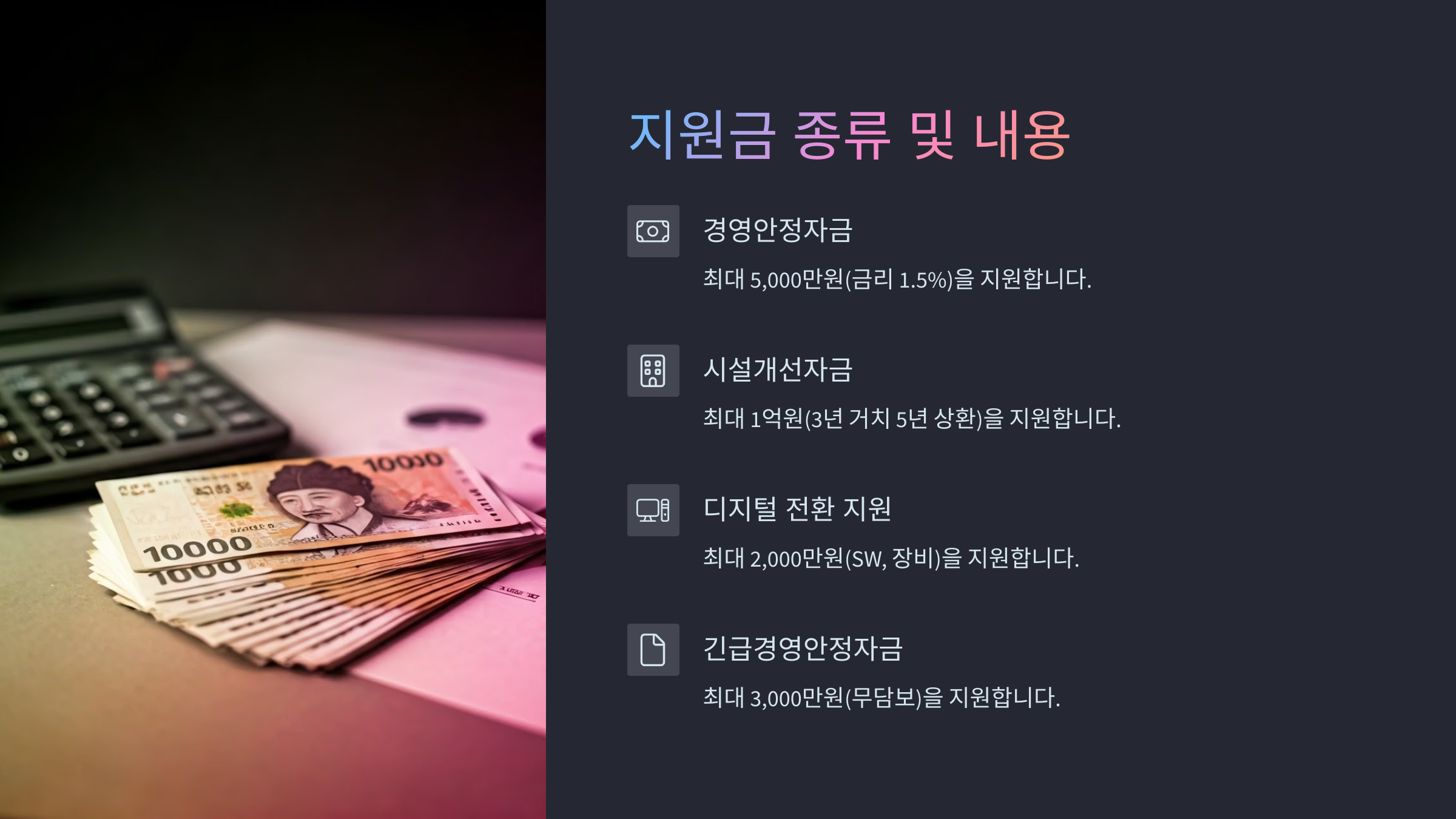 | 중소벤처기업부 | 경영안정자금, 창업지원 | 융자·현금 병행 |