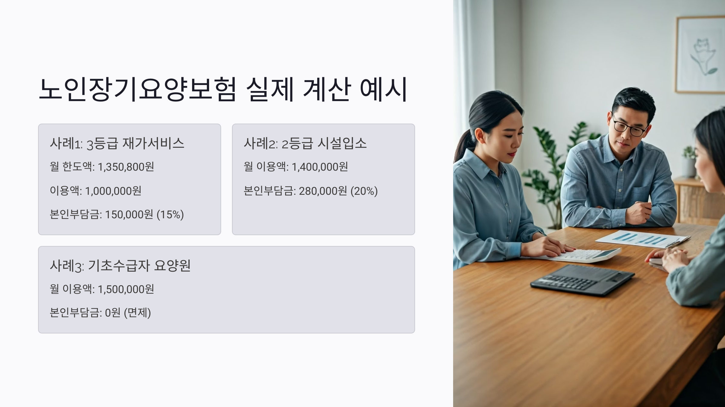 본인부담금은 등급, 이용 서비스 종류, 사용량, 소득수준, 감면 대상 여부에 따라 달라지기 때문에 계산 방법을 정확히 알아두는 것이 중요해요.