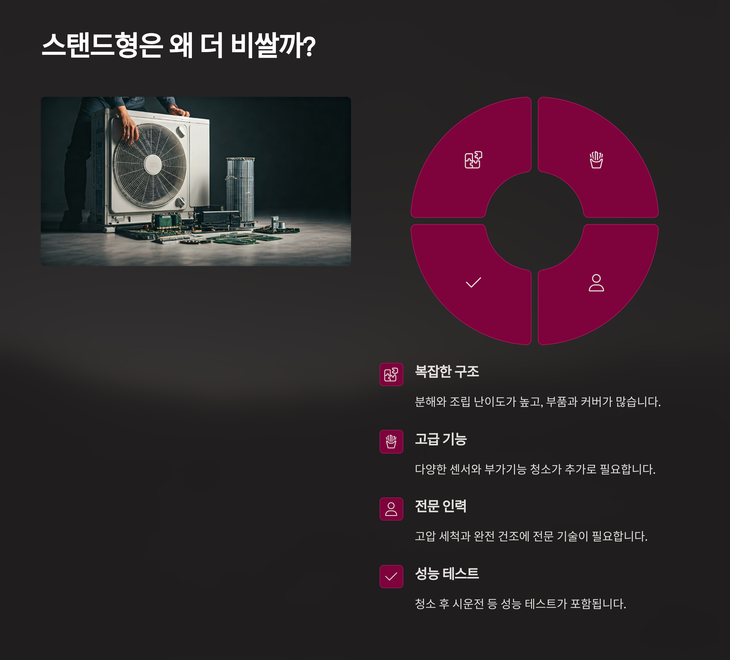 같은 항목이 포함된 청소라 하더라도 스탠드형은 구조와 공정상 추가 인력과 장비가 필수라서 가격이 올라가는 거예요.