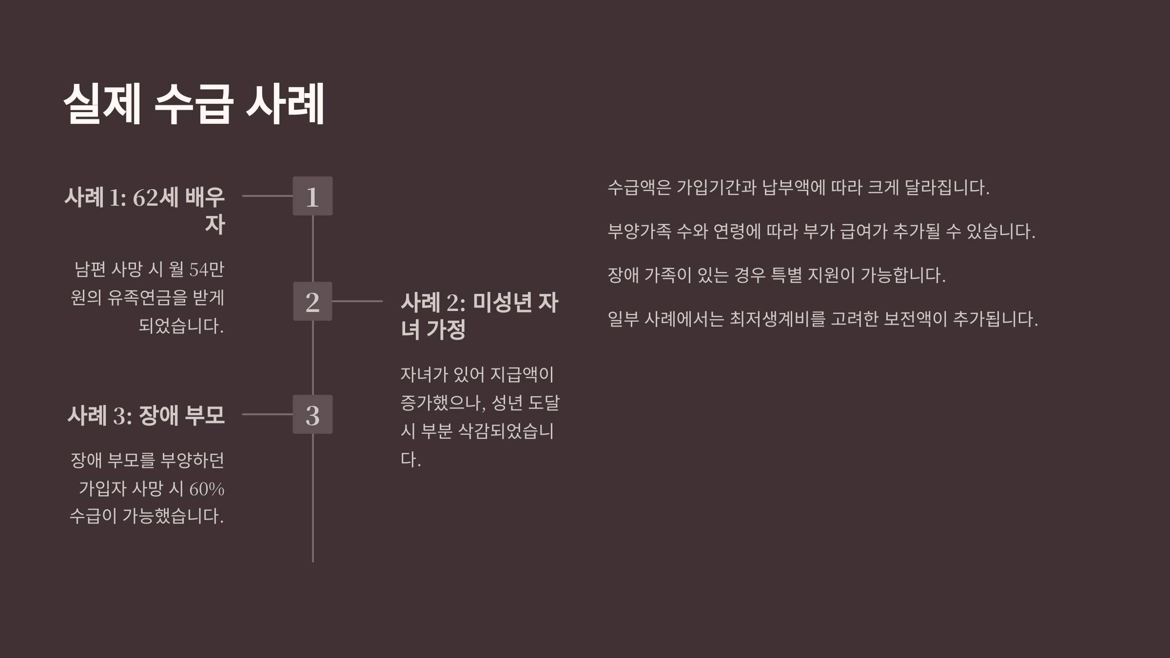 ✅ 특별 유족연금: 공무 중 순직 또는 산업재해 등으로 인한 사망 시 적용되는 별도 제도
