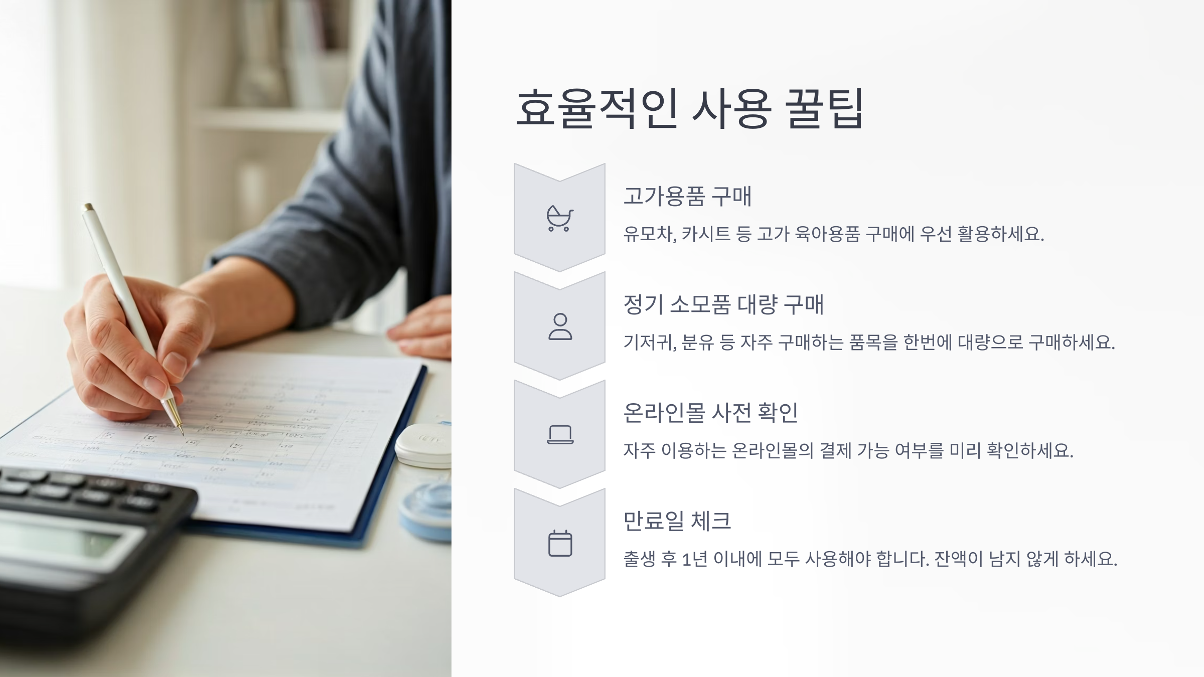 기저귀, 분유, 소아과 진료비 등 꼭 필요한 곳에 우선 사용하면 경제적으로 훨씬 유리하죠.