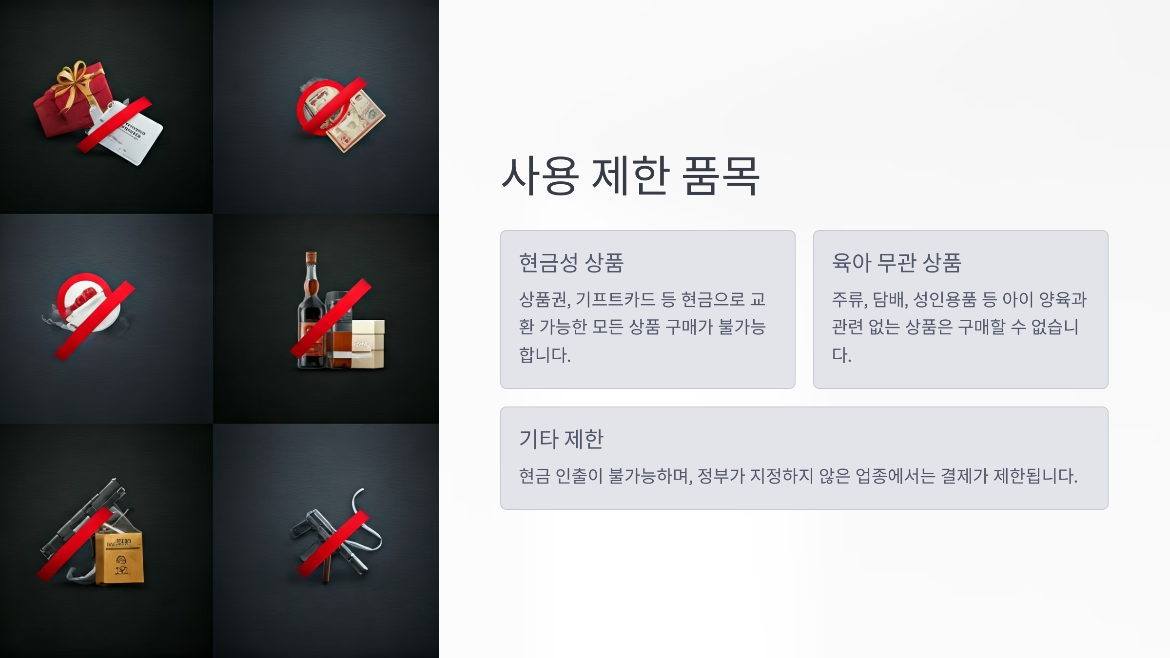 첫만남이용권은 정부 지원금인 만큼, 무분별한 사용을 막기 위해 사용 제한 품목이 있어요.