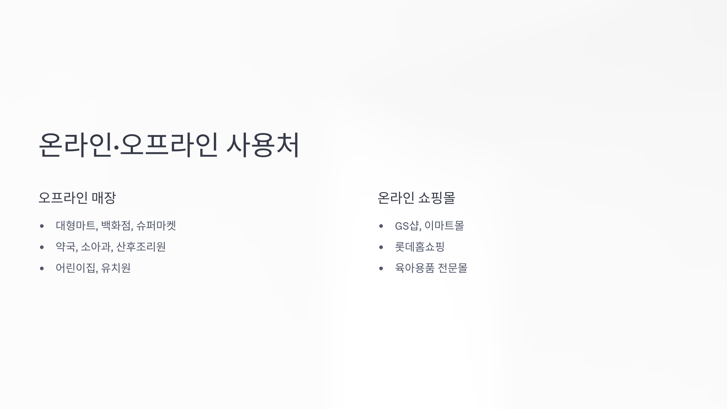 오프라인 사용은 약국, 소아과, 유아용품 매장, 산후조리원, 병원, 보건소 등에서 가능해요.