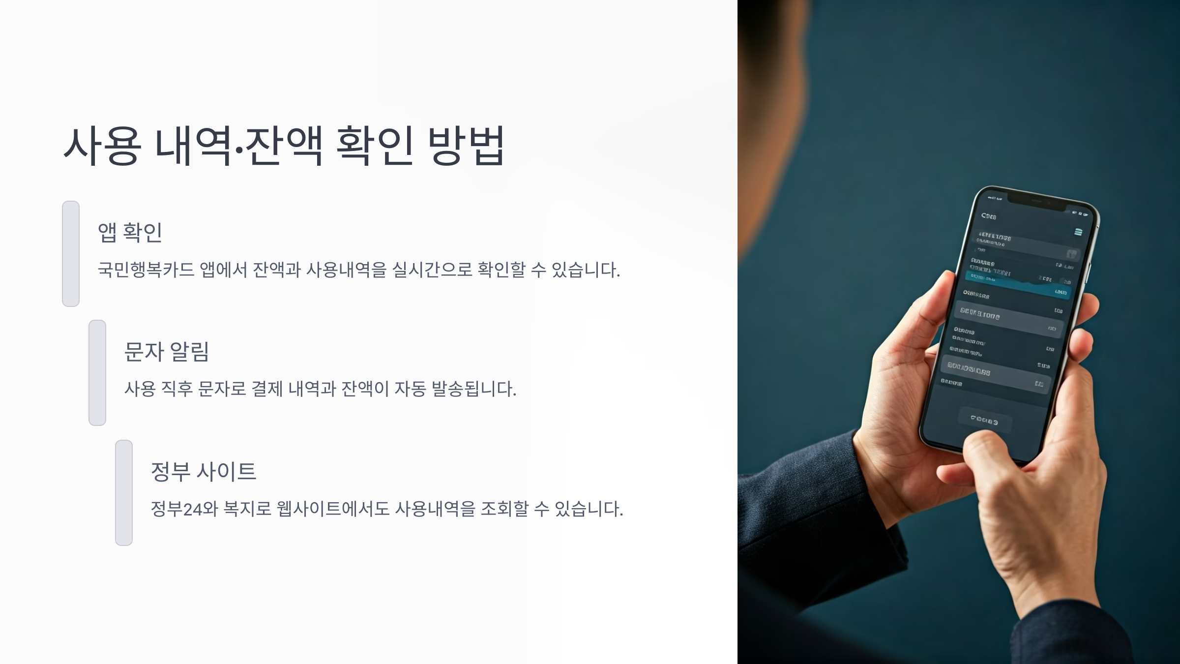 잔액과 사용 내역은 **카드사 앱**, **복지로**, **전화상담** 세 가지 방법으로 확인 가능해요.