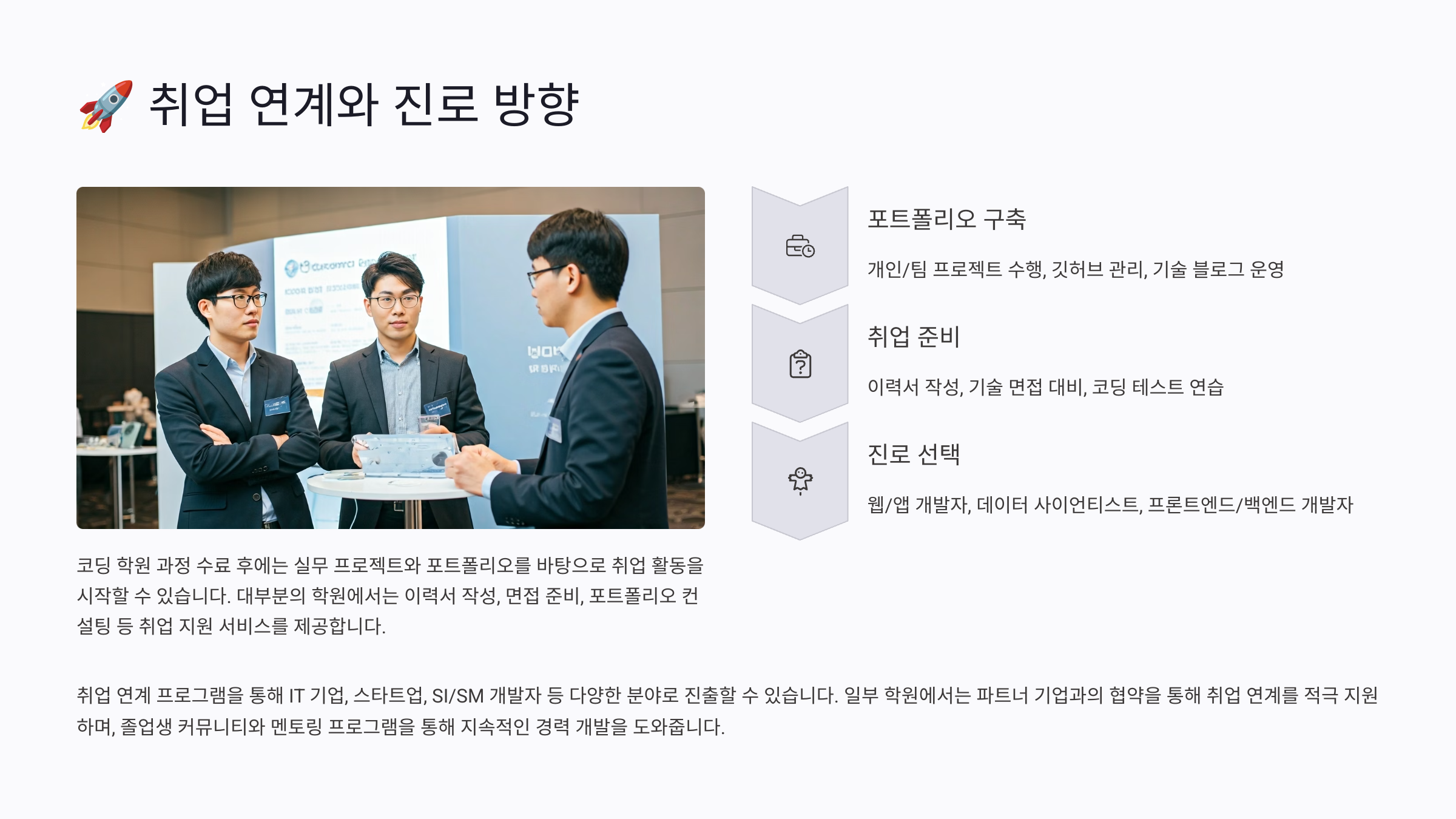 일부 코딩학원은 IT 기업과 협약을 맺고 있어 수료 후 채용 연계가 가능하고, 면접 컨설팅이나 이력서 첨삭도 지원해줘요. 취업률을 높이는 데 큰 도움이 돼요.