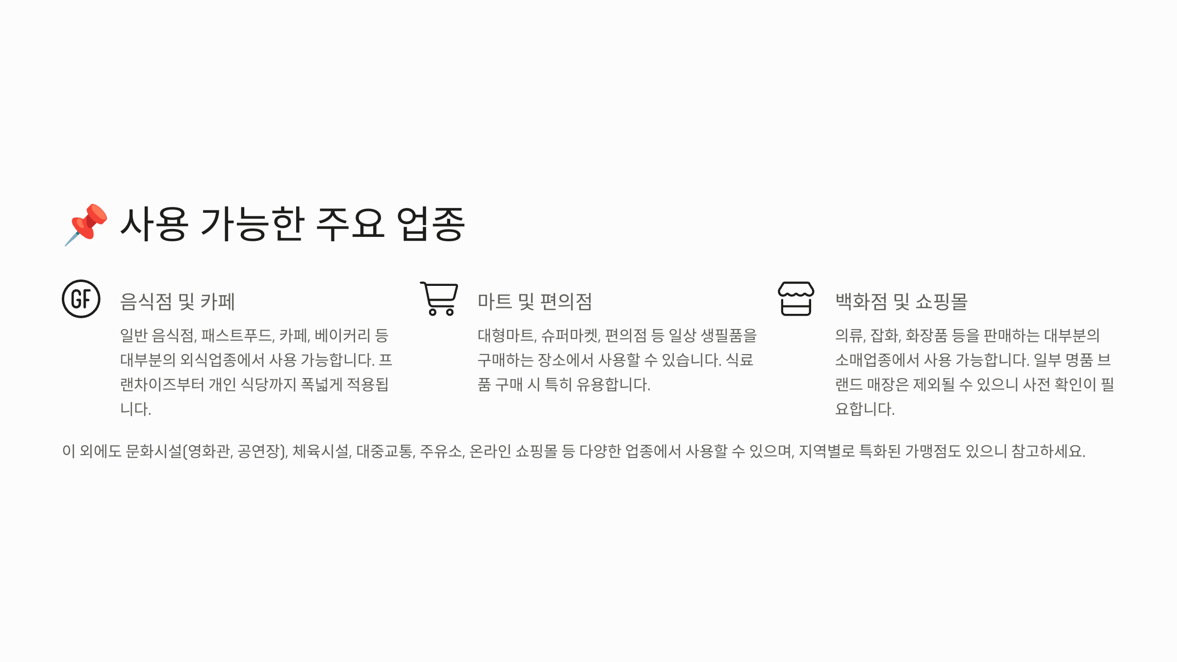 | 적용 업종 | 외식, 전통시장, 문화, 체육, 숙박 등 |