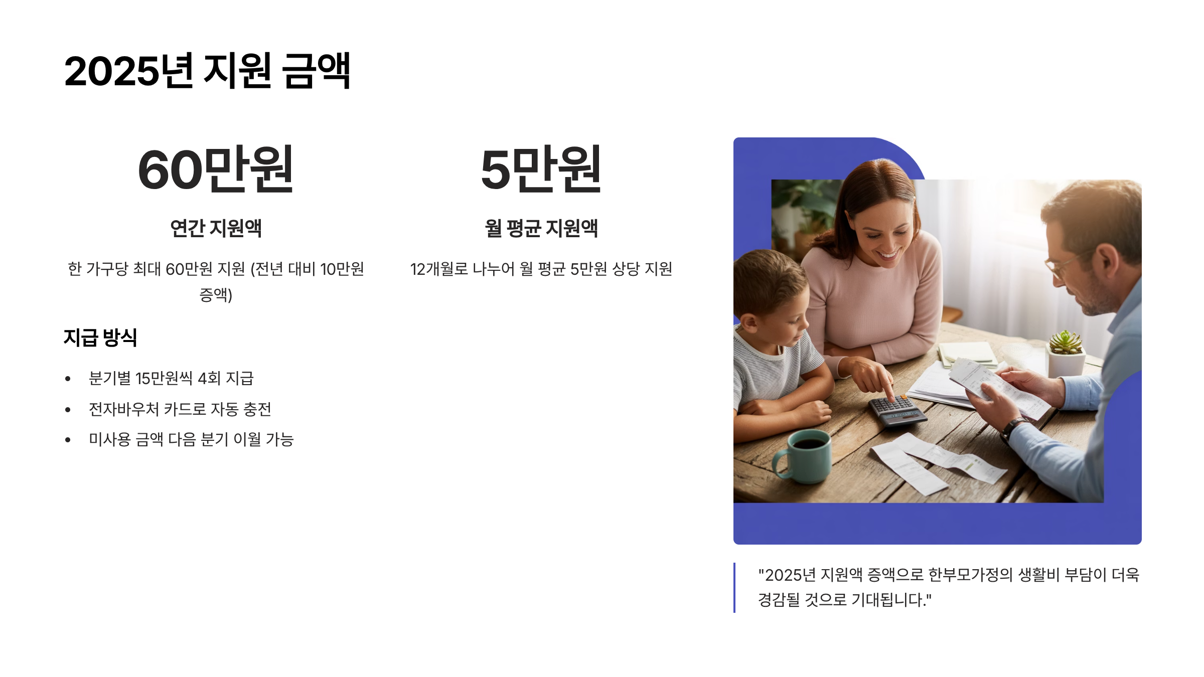 특히 자녀가 어린 한부모가정은 학원비, 교재비 등에 활용하면 체감 효과가 훨씬 커요. 실물보다 실속이 중요하니까요. 🙌
