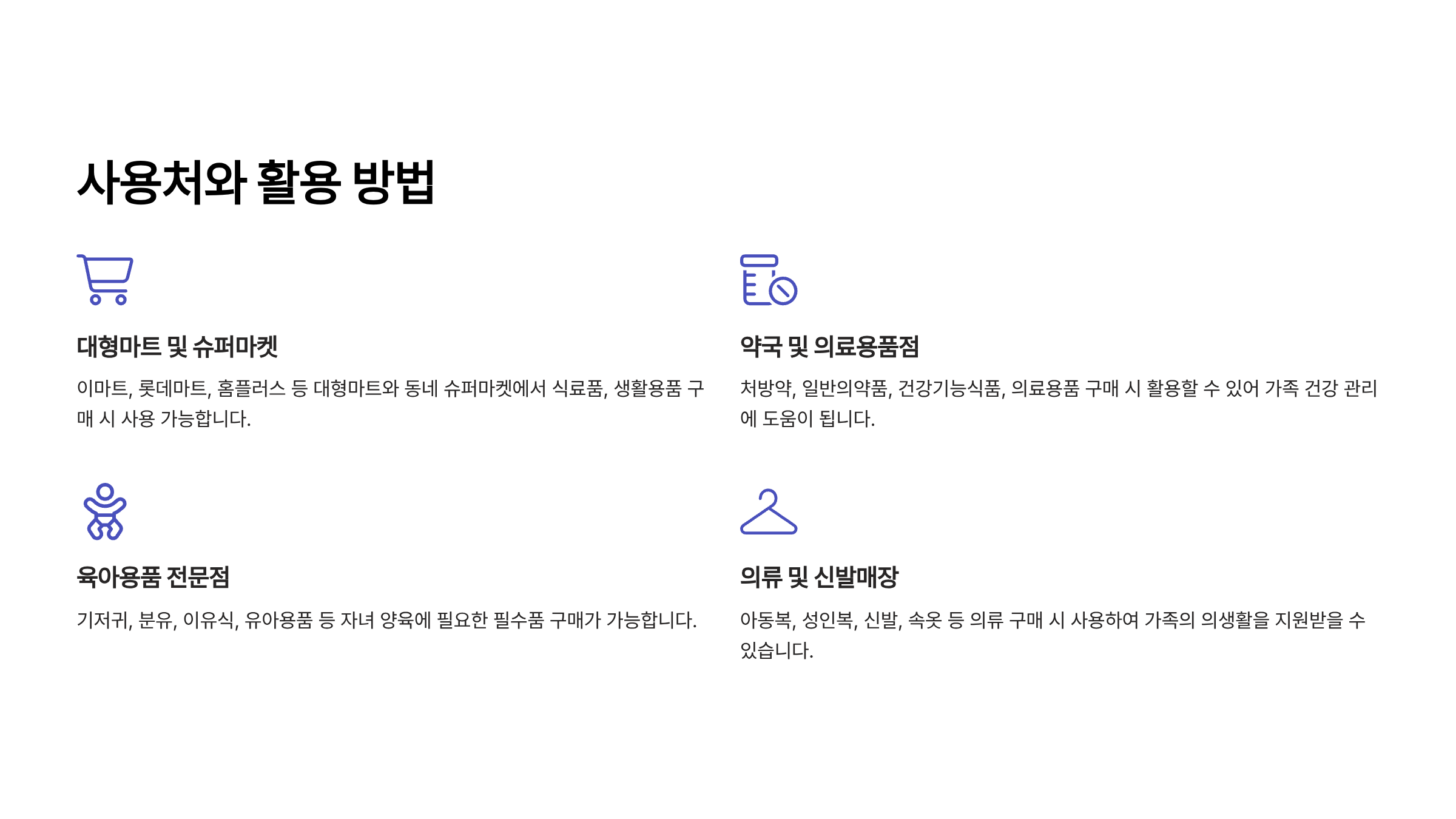 대부분 선불형 카드 또는 지역화폐 형태로 제공되며, 식료품점, 전통시장, 편의점, 일부 병원이나 학원 등에서도 사용할 수 있도록 설계돼 있어요.