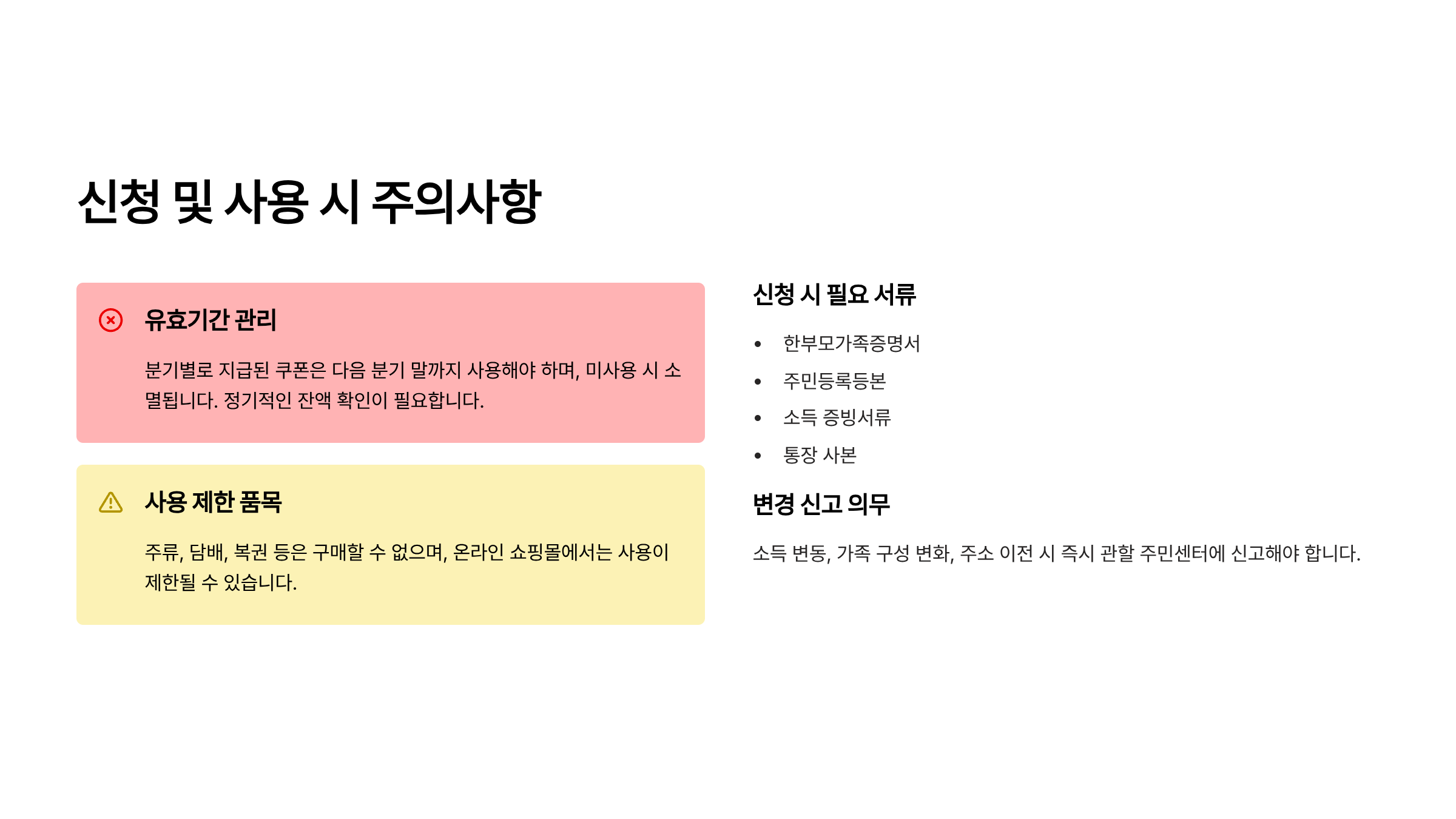 일부 지자체에서는 한부모가정 긴급생활지원금과 연계되어 1회성 쿠폰이 지급되기도 하니 지자체 공지를 꼭 체크하세요. 📌