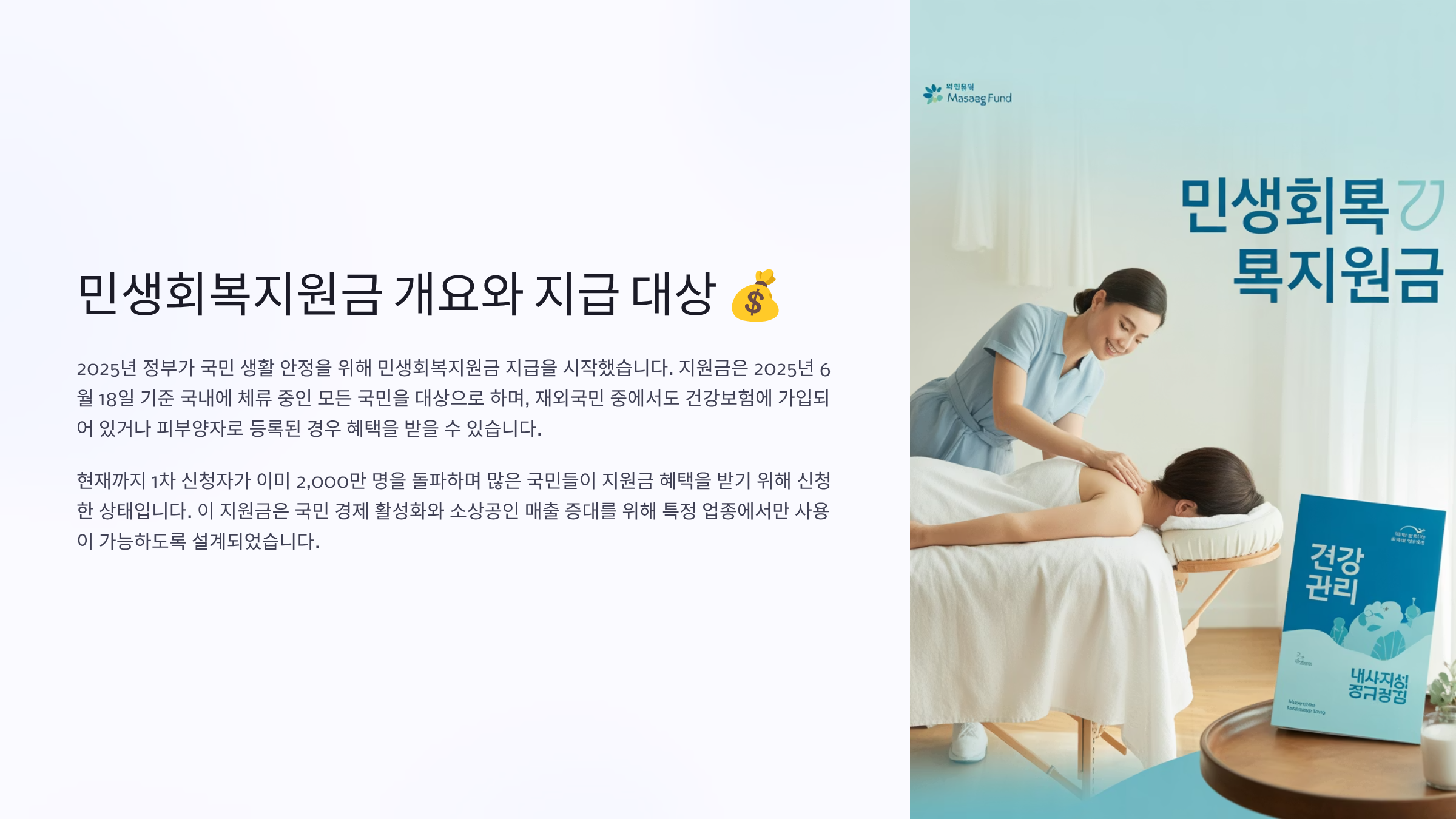 최근 정부에서 지급하는 민생회복지원금을 받으신 분들이 많으실 텐데요. 이 지원금을 어디에 사용할 수 있는지 궁금해하시는 분들이 정말 많습니다. 특히 피로 회복과 건강 관리를 위해 자주 이용하는 동네 마사지샵에서도 사용할 수 있는지 문의가 많아졌습니다. 민생회복지원금은 코로나19 이후 어려워진 서민 경제를 살리고, 소상공인들의 매출 회복을 돕기 위해 마련된 정책입니다. 하지만 모든 업종에서 사용할 수 있는 것은 아니며, 정해진 기준과 제한사항이 있어 꼼꼼히 확인해보실 필요가 있습니다.