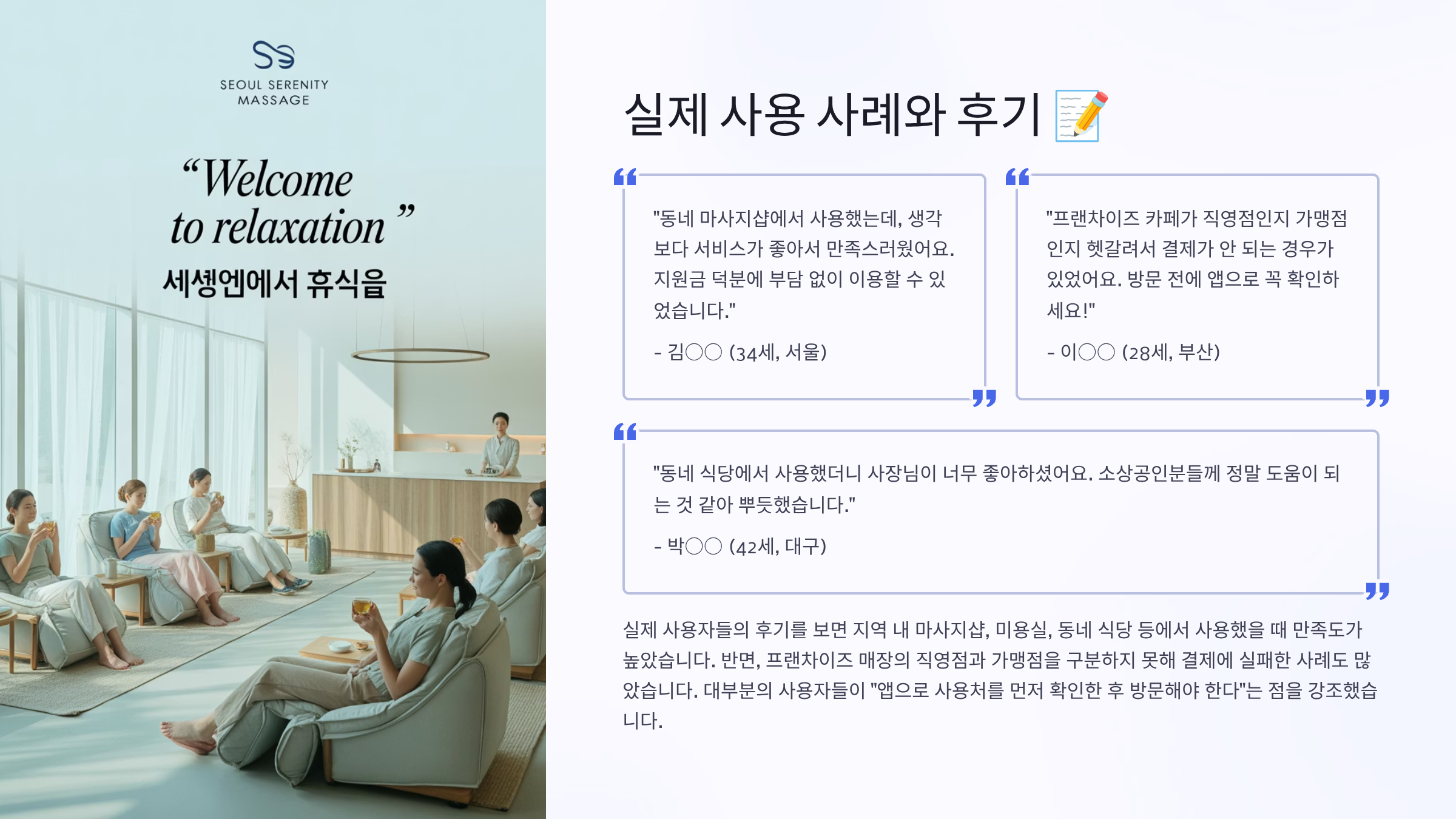 실제로 민생회복지원금을 마사지샵에서 사용한 시민들의 사례를 살펴보면, 대부분 긍정적인 경험을 했다고 합니다. 서울 강남구에 거주하는 김모씨(45세)는 "평소 발마사지를 받고 싶었지만 비용 부담으로 망설였는데, 지원금 덕분에 부담 없이 이용할 수 있었다"며 "특히 동네 작은 마사지샵도 대부분 가맹점으로 등록되어 있어 선택의 폭이 넓었다"고 전했습니다. 그는 지원금 40만원 중 절반 정도를 마사지샵에서 사용했으며, 나머지는 동네 음식점과 마트에서 사용했다고 합니다. 경기도 수원시의 박모씨(38세)는 가족과 함께 마사지샵을 이용한 사례를 소개했습니다. "부모님 모시고 온 가족이 함께 발마사지를 받았는데, 각자 지원금 카드로 결제하니 부담이 전혀 없었어요. 특히 부모님께서 너무 좋아하셔서 뿌듯했습니다." 그는 주말 오후 시간대를 이용했는데도 예약을 통해 대기 없이 서비스를 받을 수 있었다며, 사전 예약의 중요성을 강조했습니다. 또한 가족 단위 방문객에게 제공되는 추가 서비스도 만족스러웠다고 덧붙였습니다. 부산시 해운대구의 이모씨(52세)는 건강 관리 목적으로 지원금을 활용한 경우입니다. "만성 어깨 통증으로 고생하던 중 지원금으로 전문 스포츠마사지를 받을 수 있었습니다. 한 번에 8만원 정도로 부담스러운 금액이었지만, 지원금 덕분에 4회 정도 받을 수 있었고 통증이 많이 호전되었어요." 그는 단순히 일회성 소비가 아닌, 건강 투자 차원에서 지원금을 사용한 것이 매우 만족스러웠다고 평가했습니다. 반면 일부 불편한 경험을 한 사례도 있었습니다. 대구시 중구의 최모씨(29세)는 "처음 간 마사지샵에서 지원금 카드가 인식되지 않아 당황했던 경험이 있다"며 "다행히 다른 곳에서는 정상적으로 사용할 수 있었지만, 사전 확인의 필요성을 느꼈다"고 말했습니다. 또한 일부 업소에서는 지원금 결제 시 현금 결제보다 서비스 시간을 줄이는 경우도 있었다며, 이용자들의 주의가 필요하다고 조언했습니다.