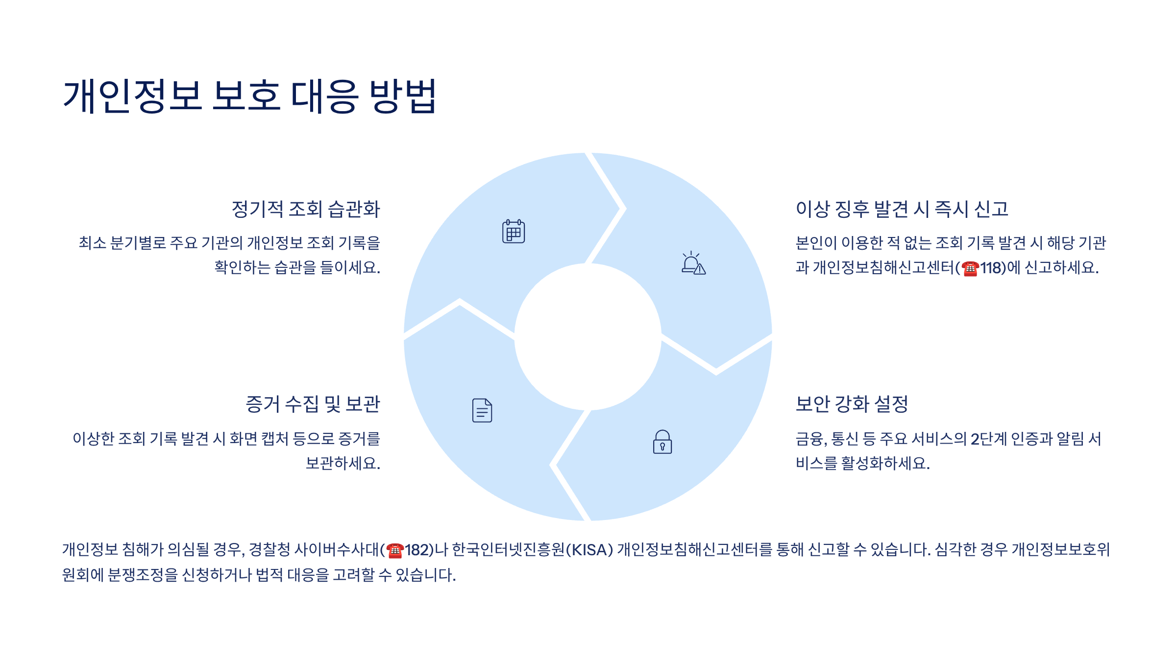 예방이 최선의 대응입니다. 정기적으로 개인정보 조회 기록을 확인하고, 의심스러운 활동이 있으면 즉시 조치를 취해야 합니다. 또한 개인정보 제공 시 최소한의 정보만 제공하고, 불필요한 마케팅 동의는 거부하는 것이 좋습니다. 온라인 서비스 이용 시에는 강력한 비밀번호와 2단계 인증을 설정하고, 공용 컴퓨터에서는 로그인을 자제해야 합니다. 개인정보는 한 번 유출되면 회수가 불가능하므로, 사전 예방이 무엇보다 중요합니다.