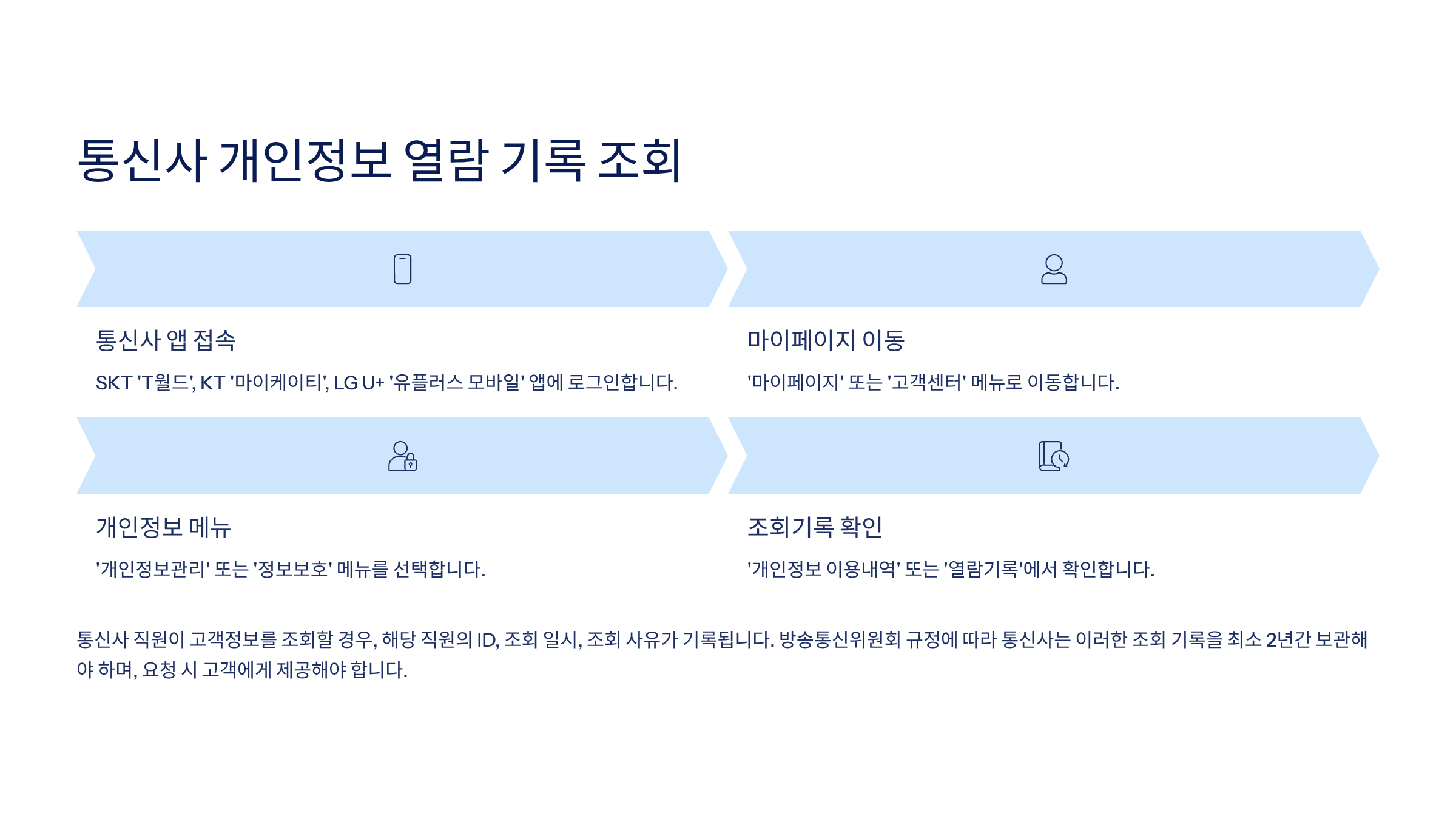 KT는 '마이케이티' 앱이나 홈페이지를 통해 개인정보 조회 이력을 제공합니다. 특히 KT는 '개인정보 이용내역 통지 서비스'를 운영하여, 본인의 개인정보가 조회될 때마다 SMS로 알림을 받을 수 있습니다. 이 서비스를 신청하면 실시간으로 개인정보 접근을 모니터링할 수 있어 보안성이 크게 향상됩니다. 통지 서비스는 무료로 제공되며, 고객센터나 대리점에서 신청할 수 있습니다.