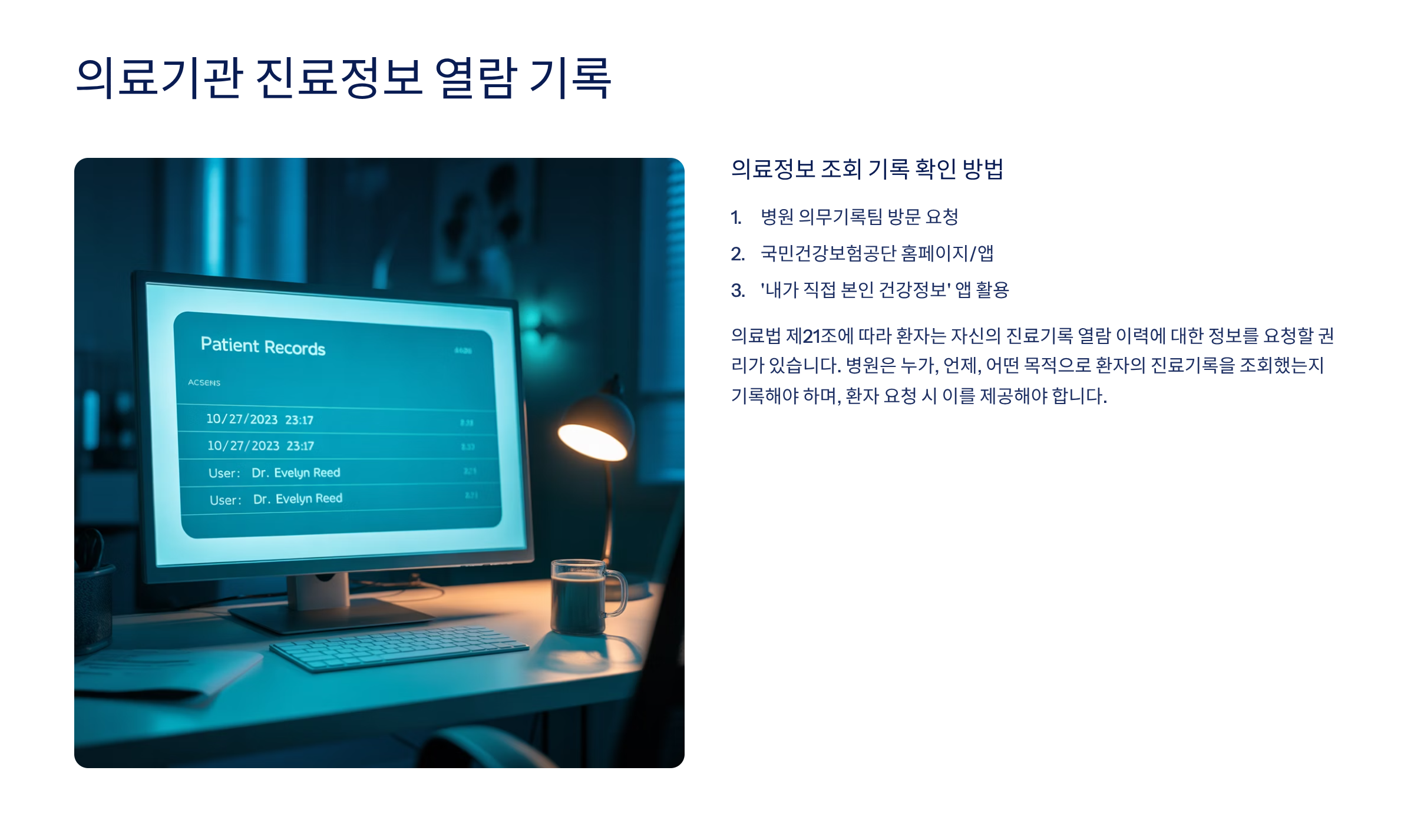 의료정보 열람 기록을 정기적으로 확인하는 것은 의료 프라이버시를 지키는 첫걸음입니다. 특히 민감한 질병이나 정신건강 관련 진료를 받은 경우, 해당 정보가 적절히 보호되고 있는지 더욱 주의 깊게 살펴봐야 합니다. 의료기관은 환자의 요청이 있을 경우 10일 이내에 열람 기록을 제공해야 하며, 이를 거부할 경우 과태료가 부과될 수 있습니다.