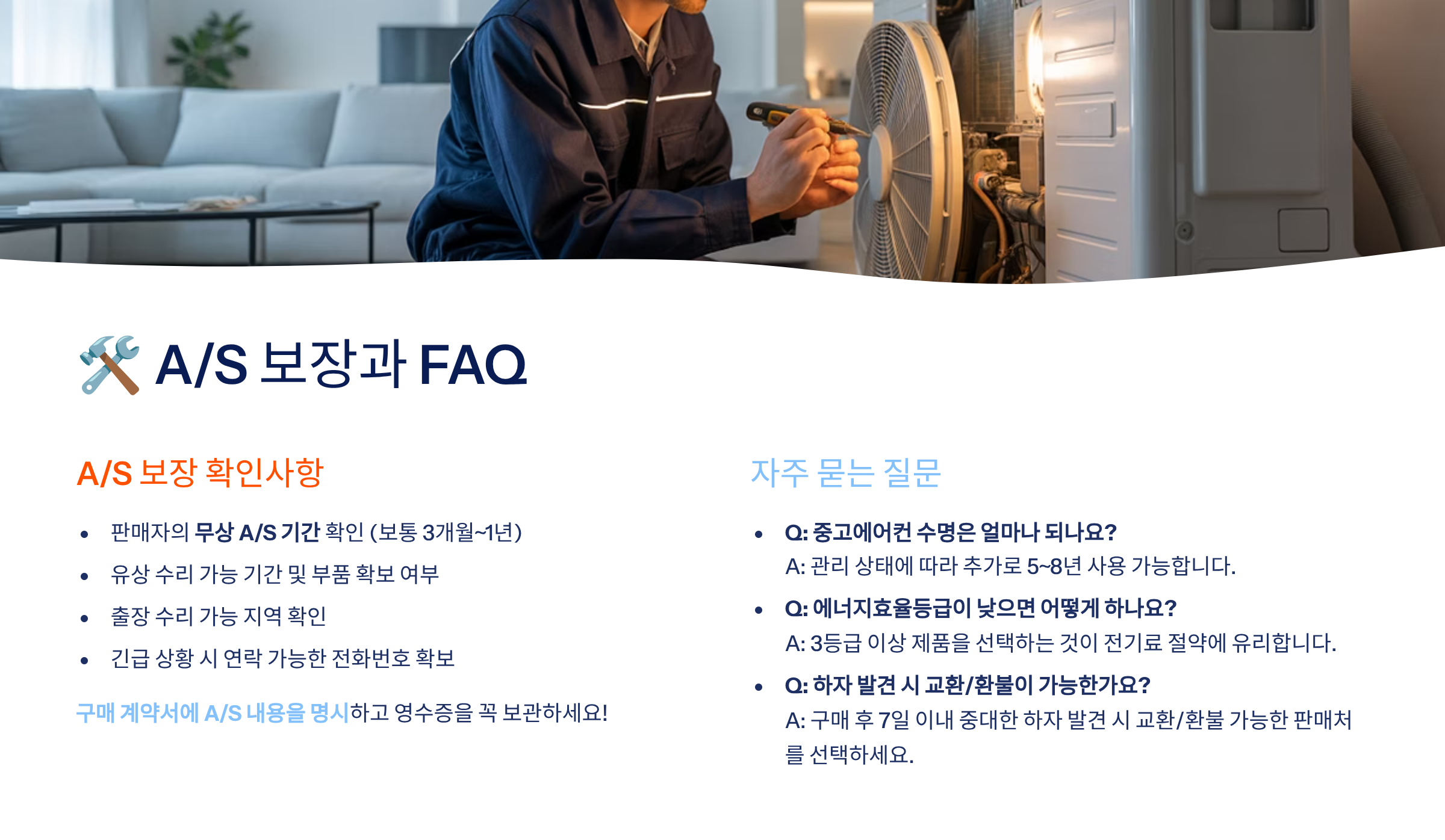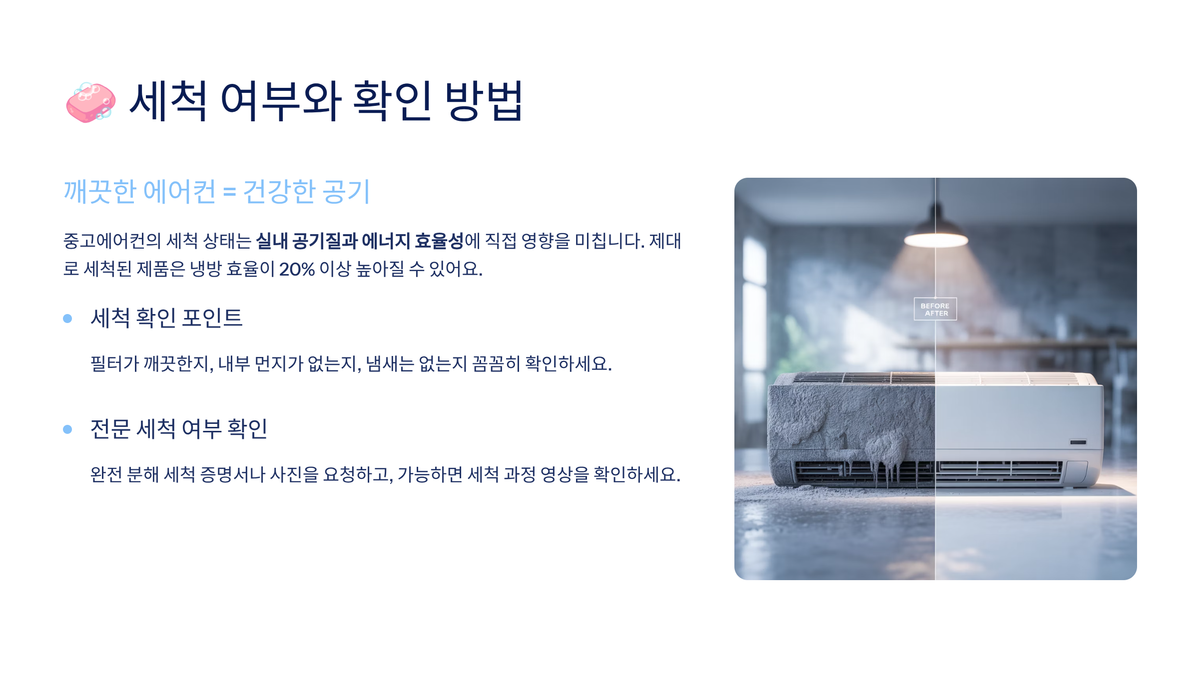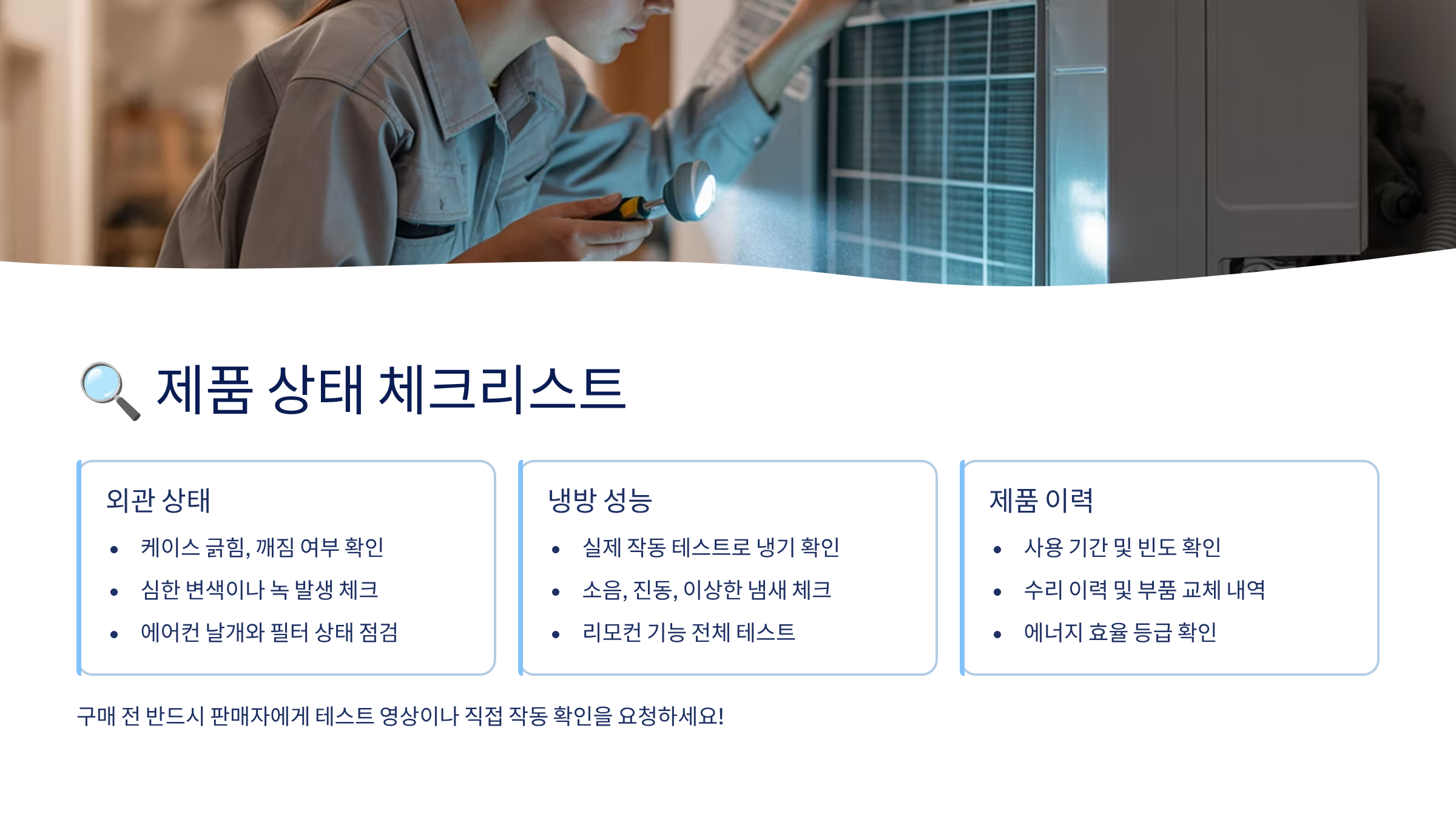 중고에어컨을 고를 땐 무조건 ‘겉만 깨끗한지’ 보지 말고, 아래 항목을 꼭 체크해보세요! ✅