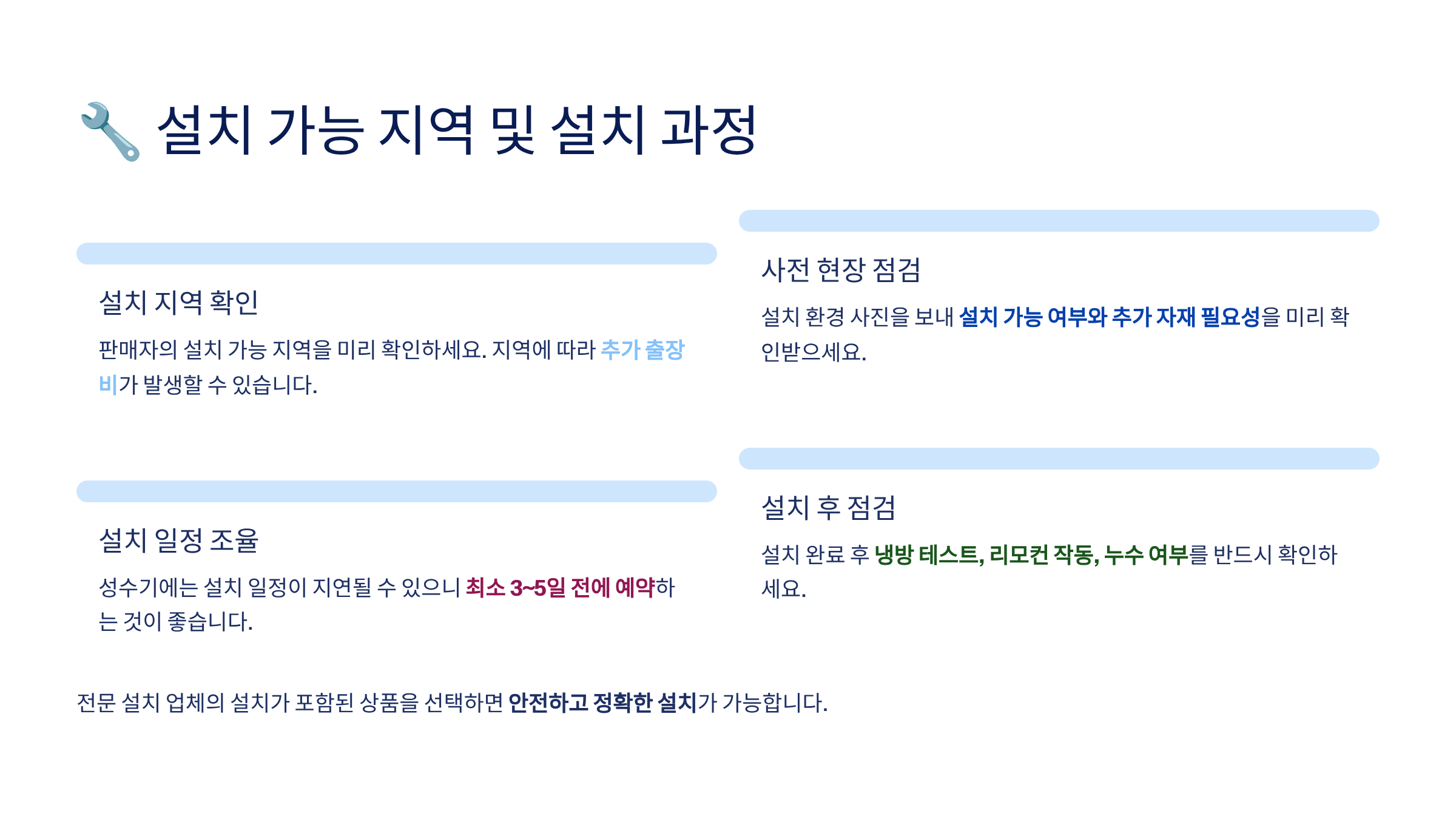 설치는 서울, 경기 지역에서만 가능하고, 지방이나 외곽 지역은 협의 후 가능 여부를 확인해야 해요. 설치는 제품 도착 후 2~5일 이내 진행되며, 설치비는 별도예요. 홈페이지에서 설치비 내역도 미리 확인 가능했어요.