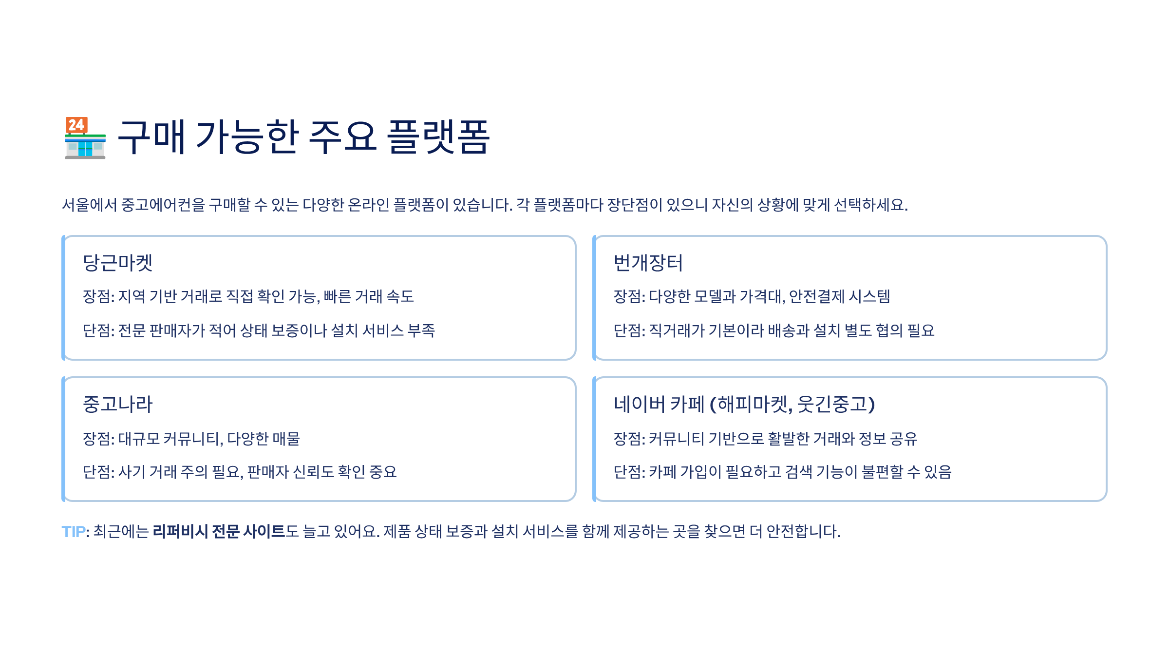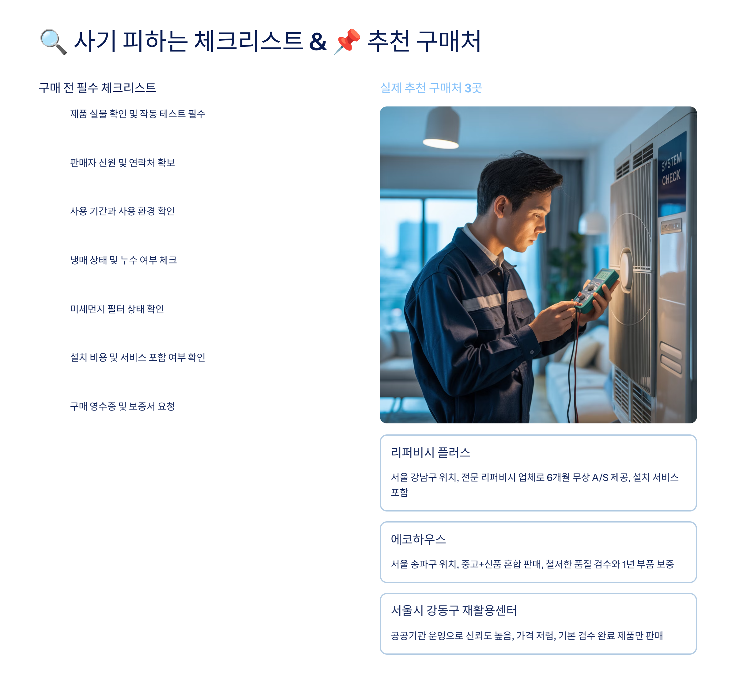 중고거래는 저렴한 대신 사기 가능성도 존재해요. 특히 에어컨처럼 설치가 필요한 제품은 더더욱 신뢰할 수 있는 업체를 통해야 해요. 서울에서는 다양한 선택지가 있지만, 그만큼 '가짜 설치기사' 또는 ‘청소 안 된 에어컨’을 파는 사례도 있어요. 🤨