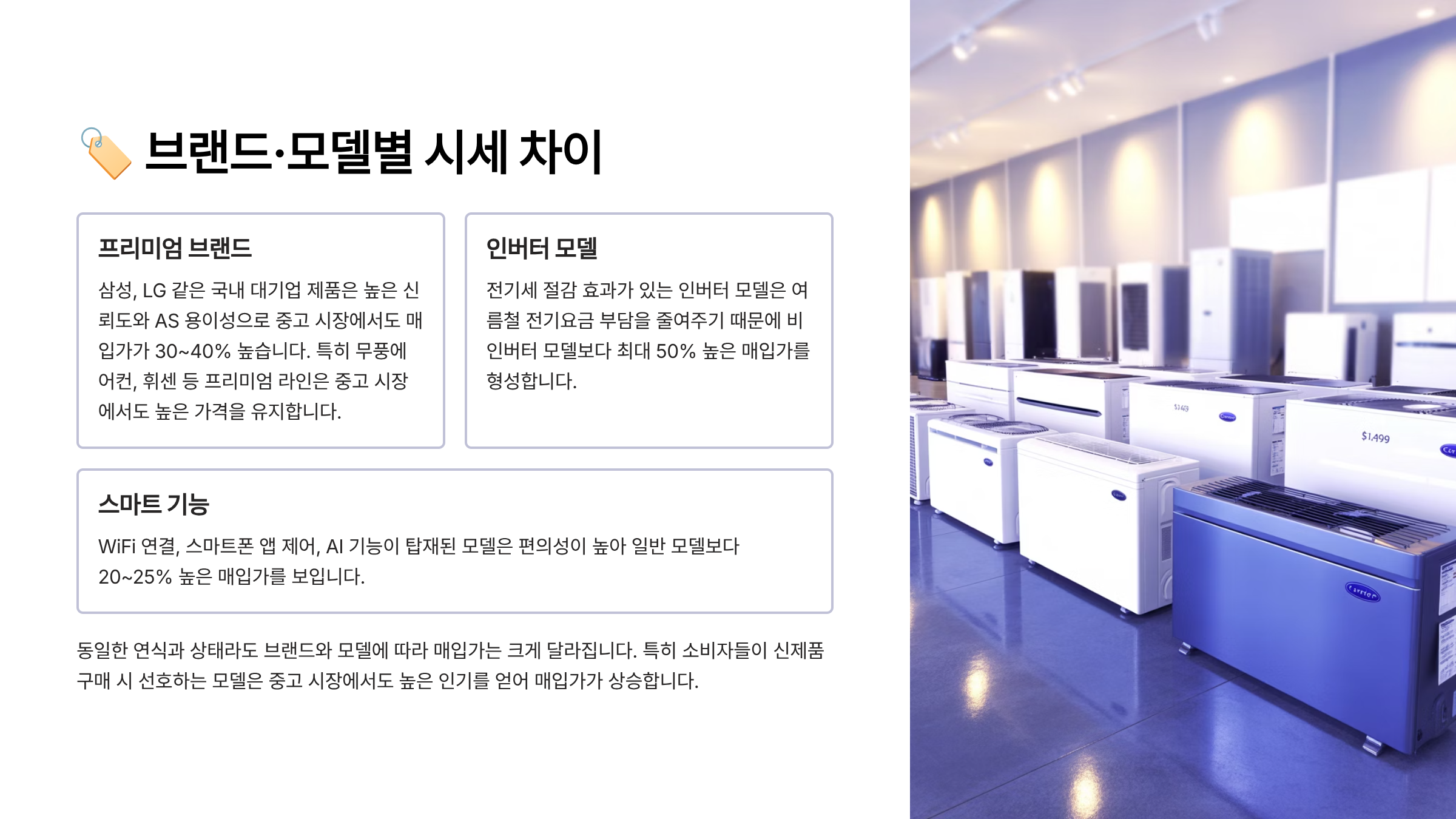 여름철 중고 에어컨 매입가가 오르는 건 사실이지만, 모든 제품이 동일하게 평가되는 건 아니에요. 브랜드와 모델에 따라 매입가 차이가 크게 발생하죠.