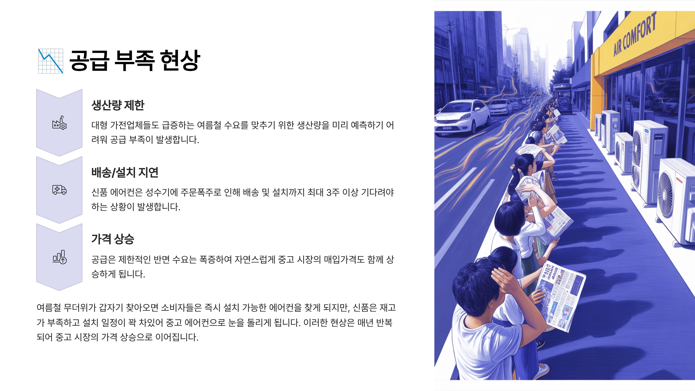 새 제품은 설치 대기 기간이 길어 바로 사용하기 어렵지만, 중고 제품은 철거 후 바로 설치가 가능하다는 장점이 있어요. 이 때문에 여름철에는 수요가 폭발적으로 늘어나고, 자연스럽게 매입가도 높아지게 된답니다.
