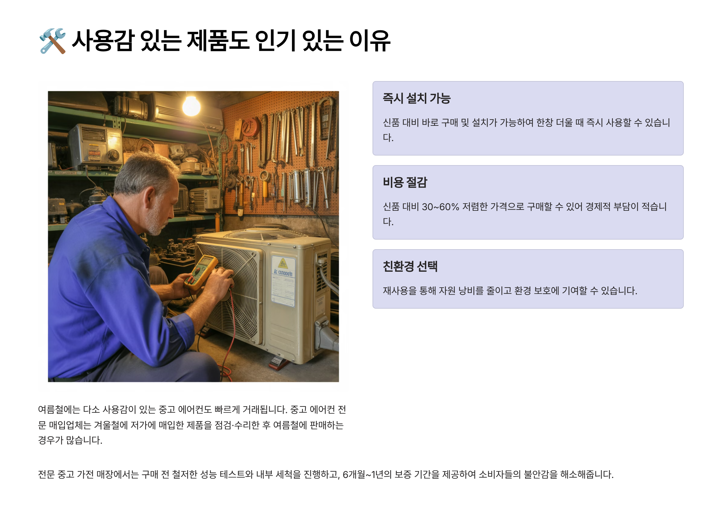 또한 폐업하는 상가나 이사하는 가정에서 나오는 사용감 있는 에어컨은 설치 이력이 분명해 안전하다고 판단하는 소비자도 많아요. 그래서 여름철엔 중고 시장에서 더욱 활발하게 거래된답니다. 🔥