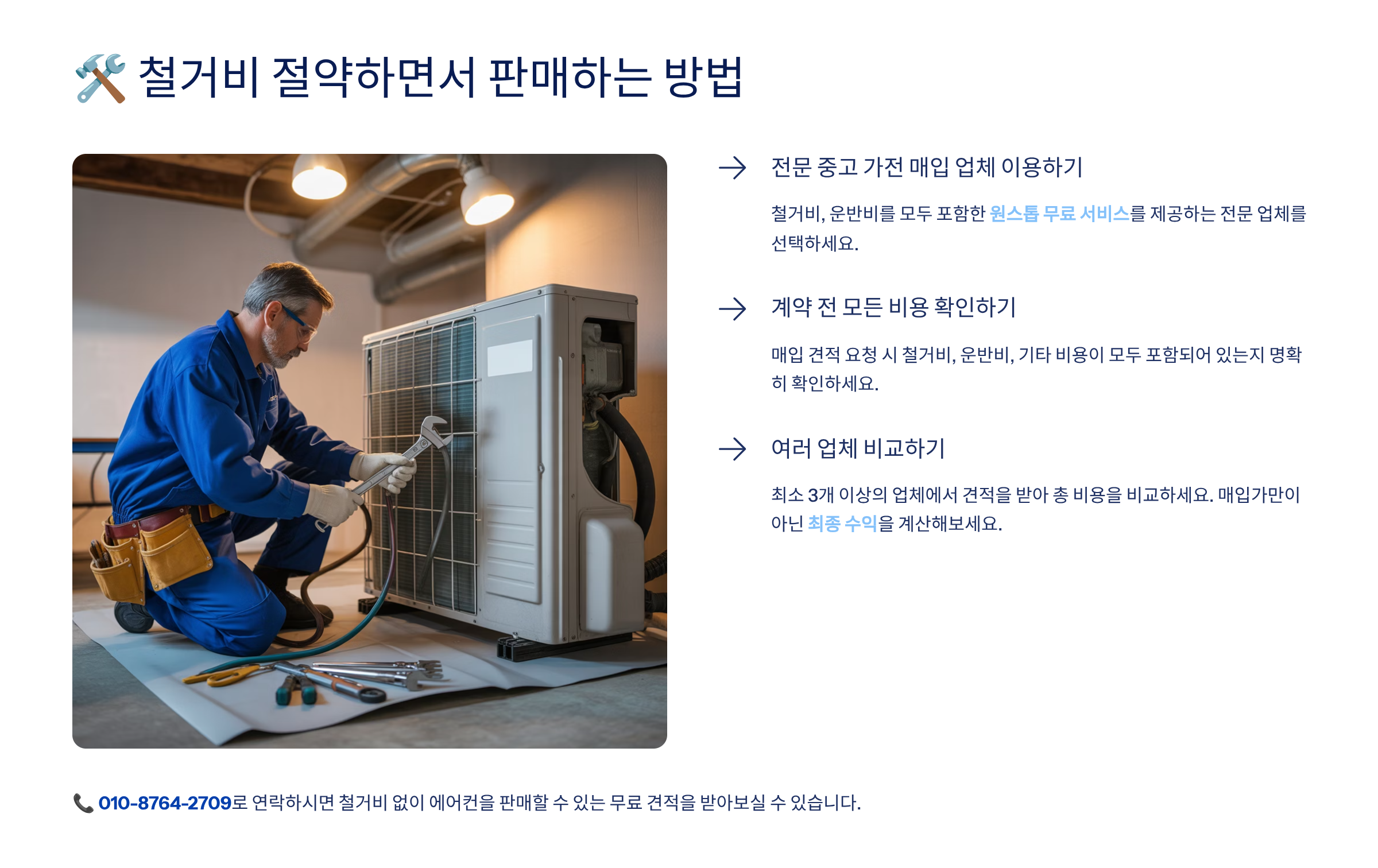 중고 에어컨을 팔 때 많은 분들이 놓치는 부분이 바로 철거비예요. 단순히 매입가만 신경 쓰다가 철거비로 예상보다 더 지출하는 경우가 적지 않아요.