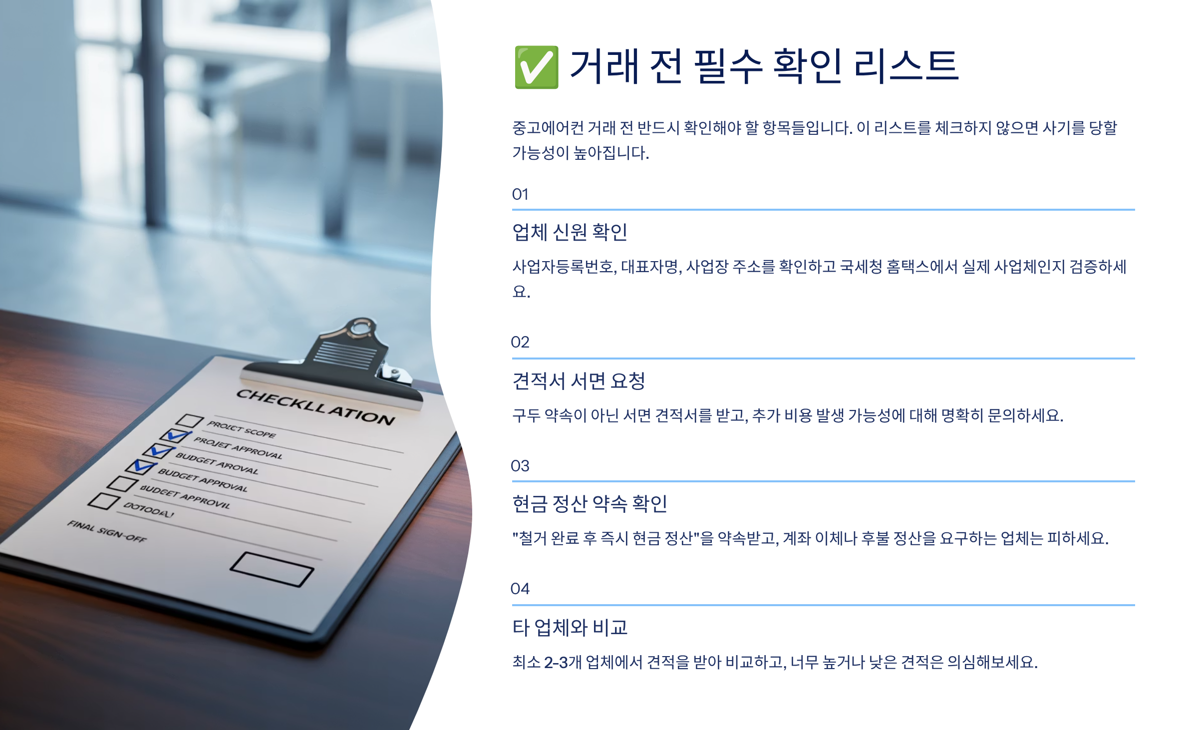 아래 체크리스트를 활용하면 중고에어컨 팔 때 사기 피해를 크게 줄일 수 있어요.