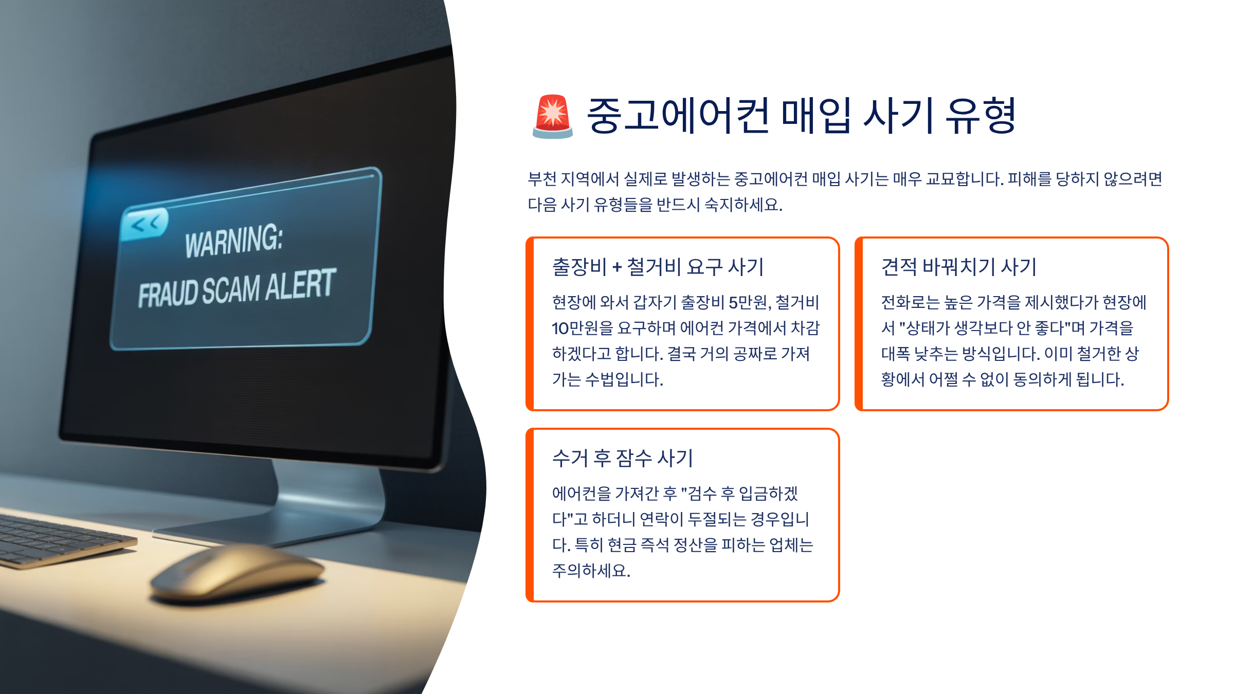 부천에서 실제로 발생하는 중고에어컨 사기 유형은 다양해요. 매입한다고 해놓고 현장에선 말을 바꾸거나, 수거 후 정산을 미루는 경우도 종종 있어요. 아래 유형들을 꼭 기억하세요!