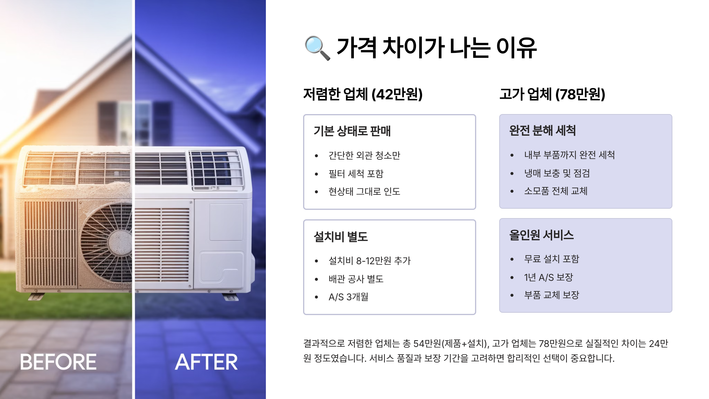 보시다시피, 본체 가격만 싸다고 좋은 게 아니에요. 설치와 서비스까지 합쳐야 진짜 합리적인 선택이 가능하다는 걸 알 수 있었어요. ✔