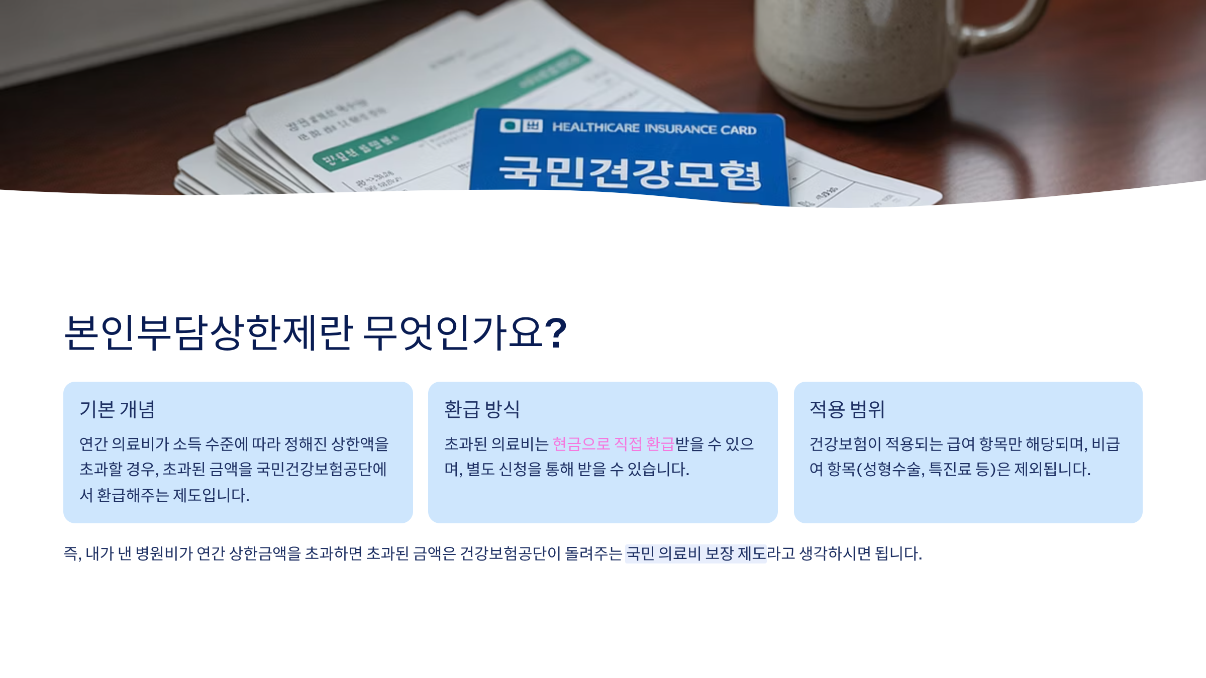 본인부담상한제는 병원비가 과도하게 나와도 일정 금액까지만 본인이 부담하고, 그 이상은 건강보험공단이 환급해주는 제도예요. 🏥