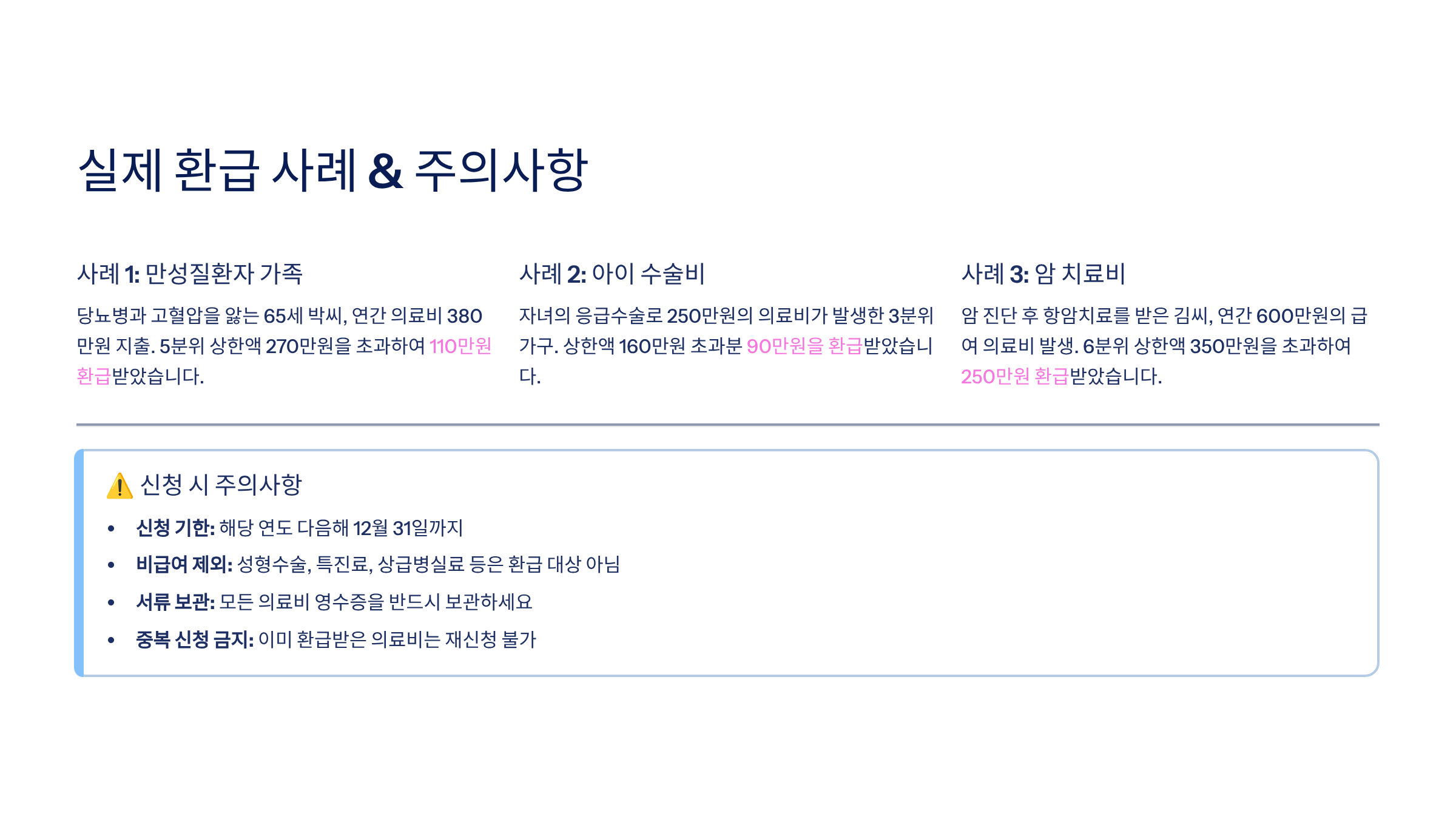 ✔ 40대 맞벌이 부부: 가족 전체 병원비 600만 원 → 세대 단위로 환급 150만 원