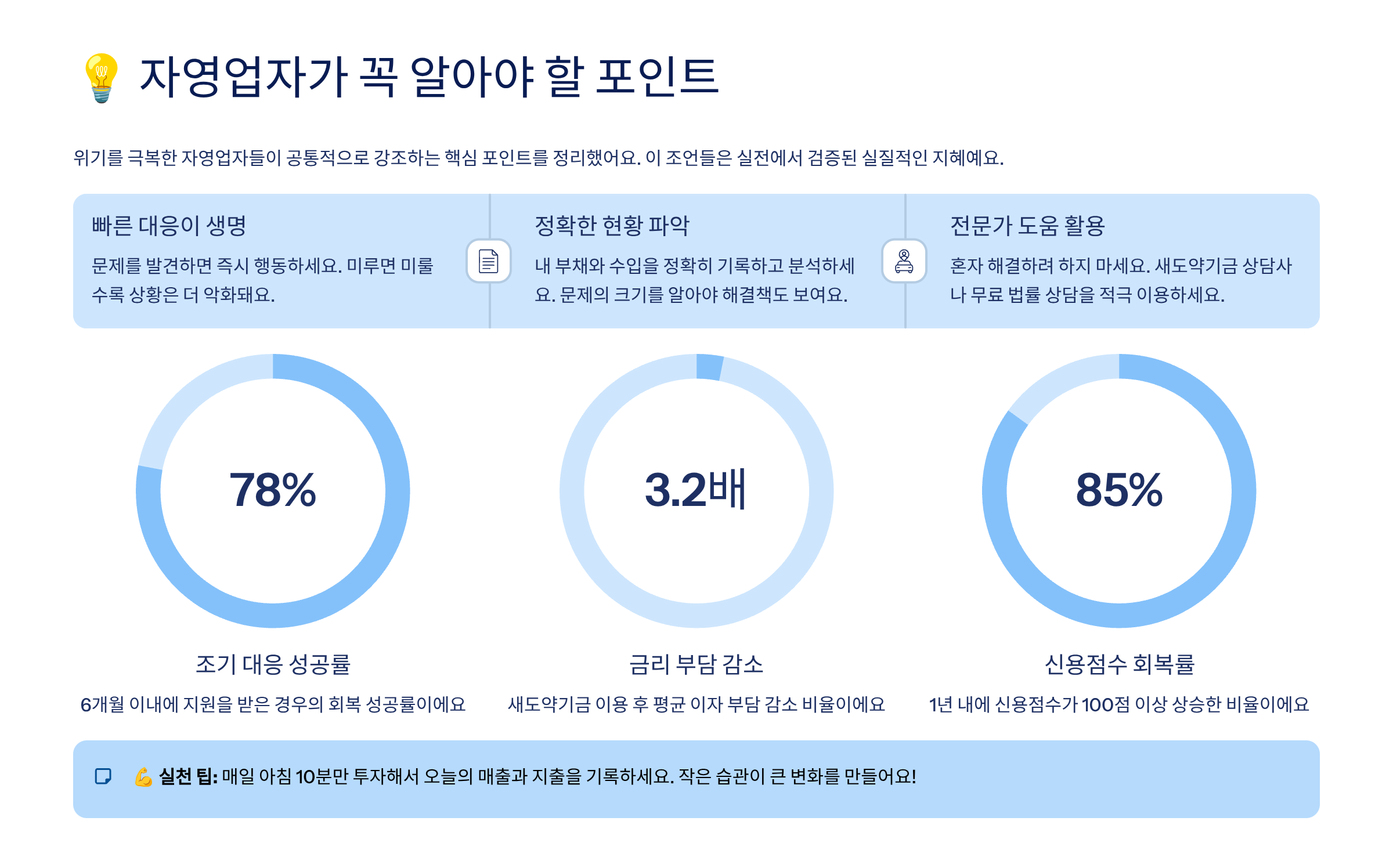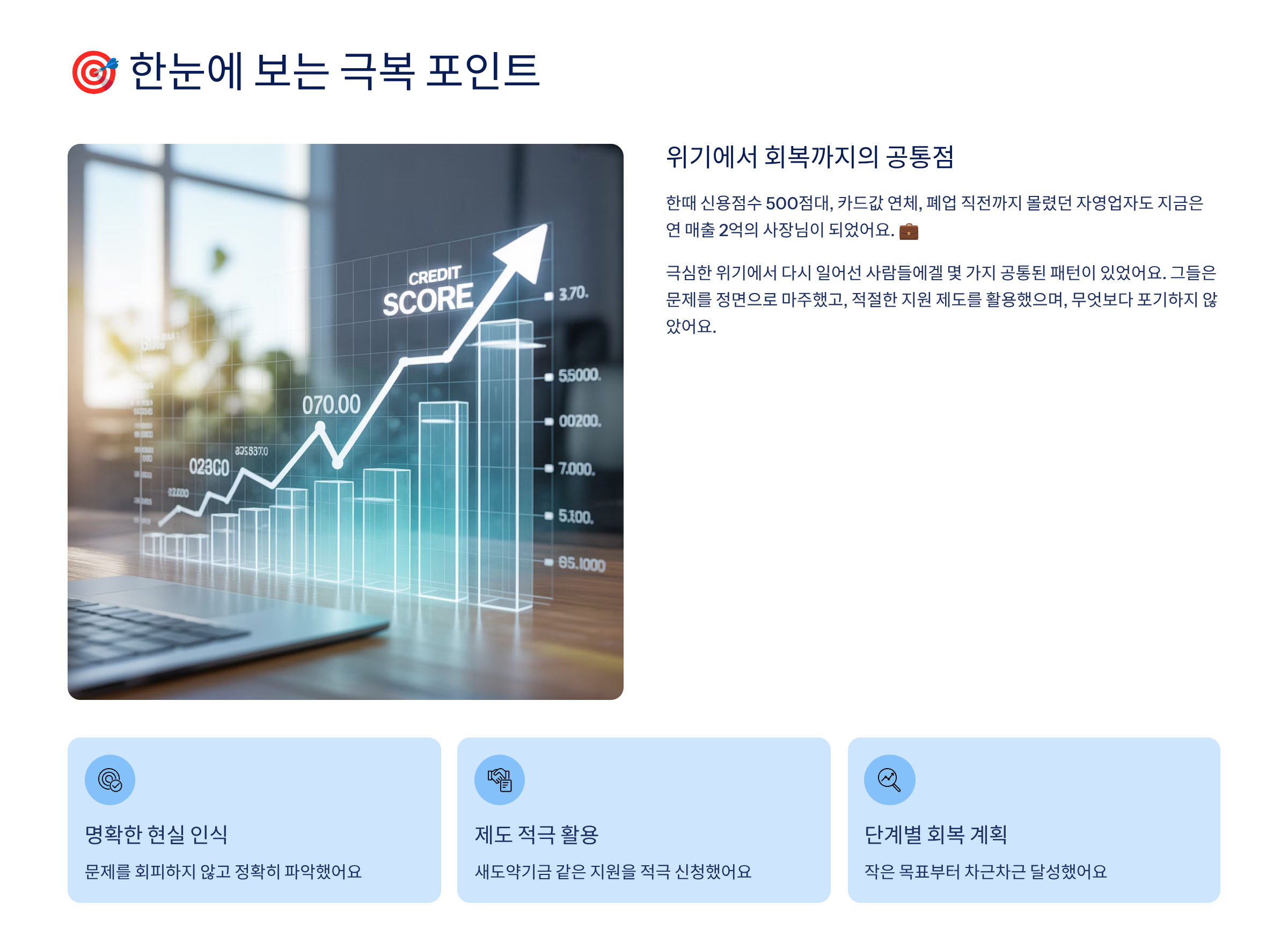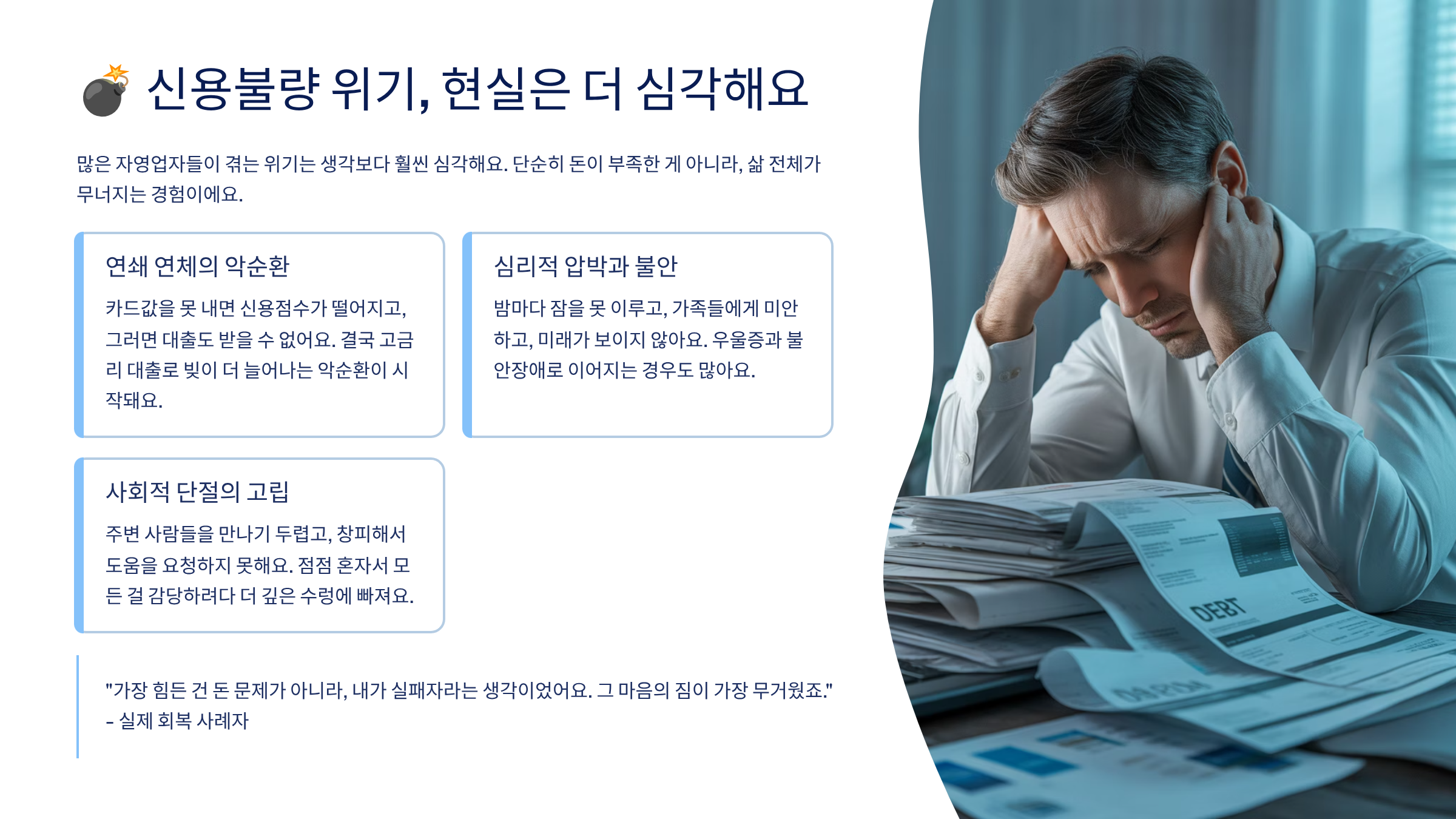 내가 장사해서 내 이름으로 번 돈이었는데, 어느 순간 은행에서도 외면당하고, 가족에게도 미안해지고, 사회적으로 고립되는 기분이 들죠. 이런 상황에서 필요한 건 단순한 위로가 아니라 ‘현실적 해결책’이에요.