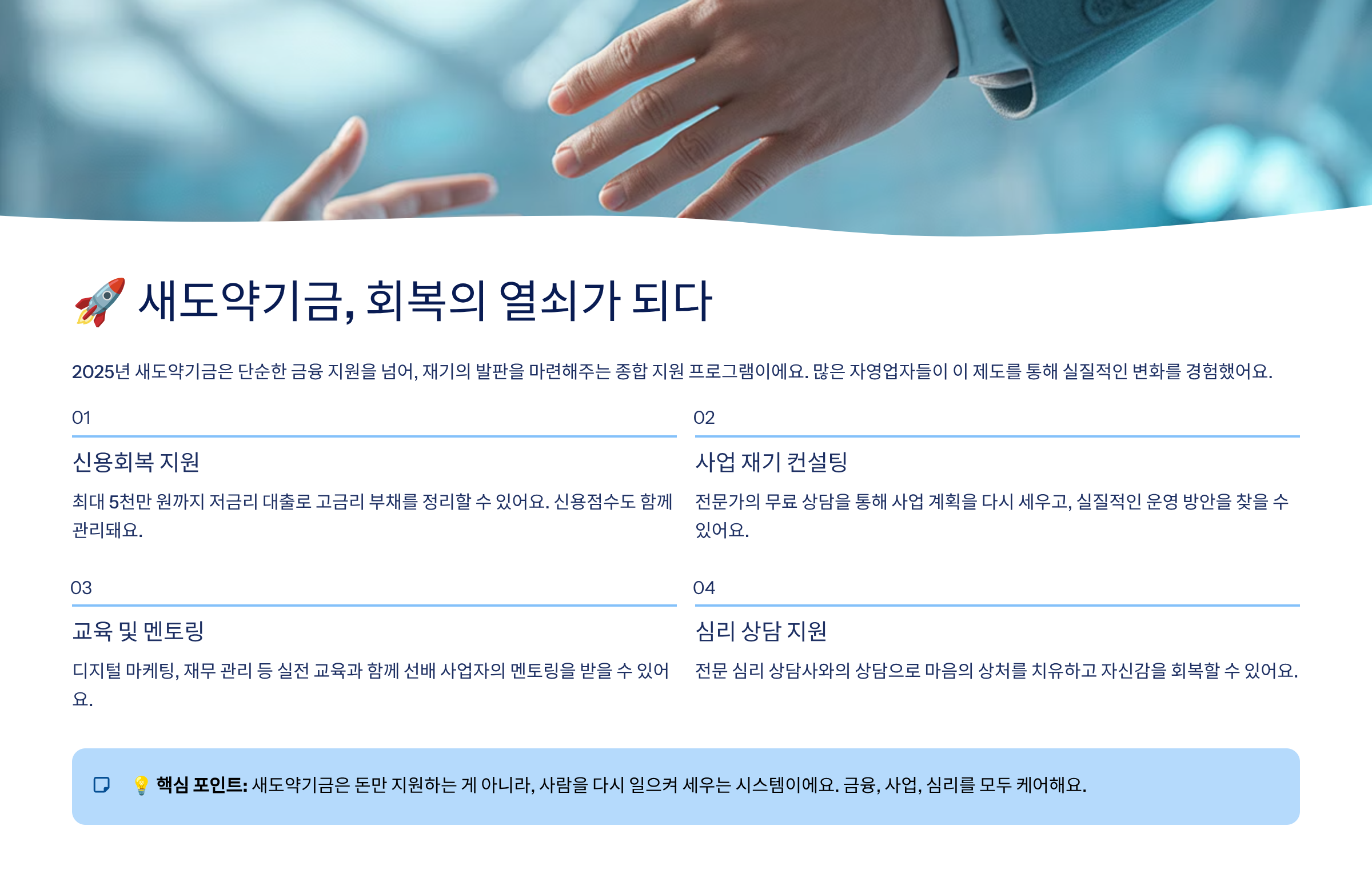 다행히도, 정부는 이 절박함을 외면하지 않았어요. 그렇게 나온 제도가 바로 새도약기금이에요. 이 제도는 무조건 잘나가는 사장님만을 위한 게 아니에요. 다시 시작하려는 사람을 위한 기회예요. 🌱