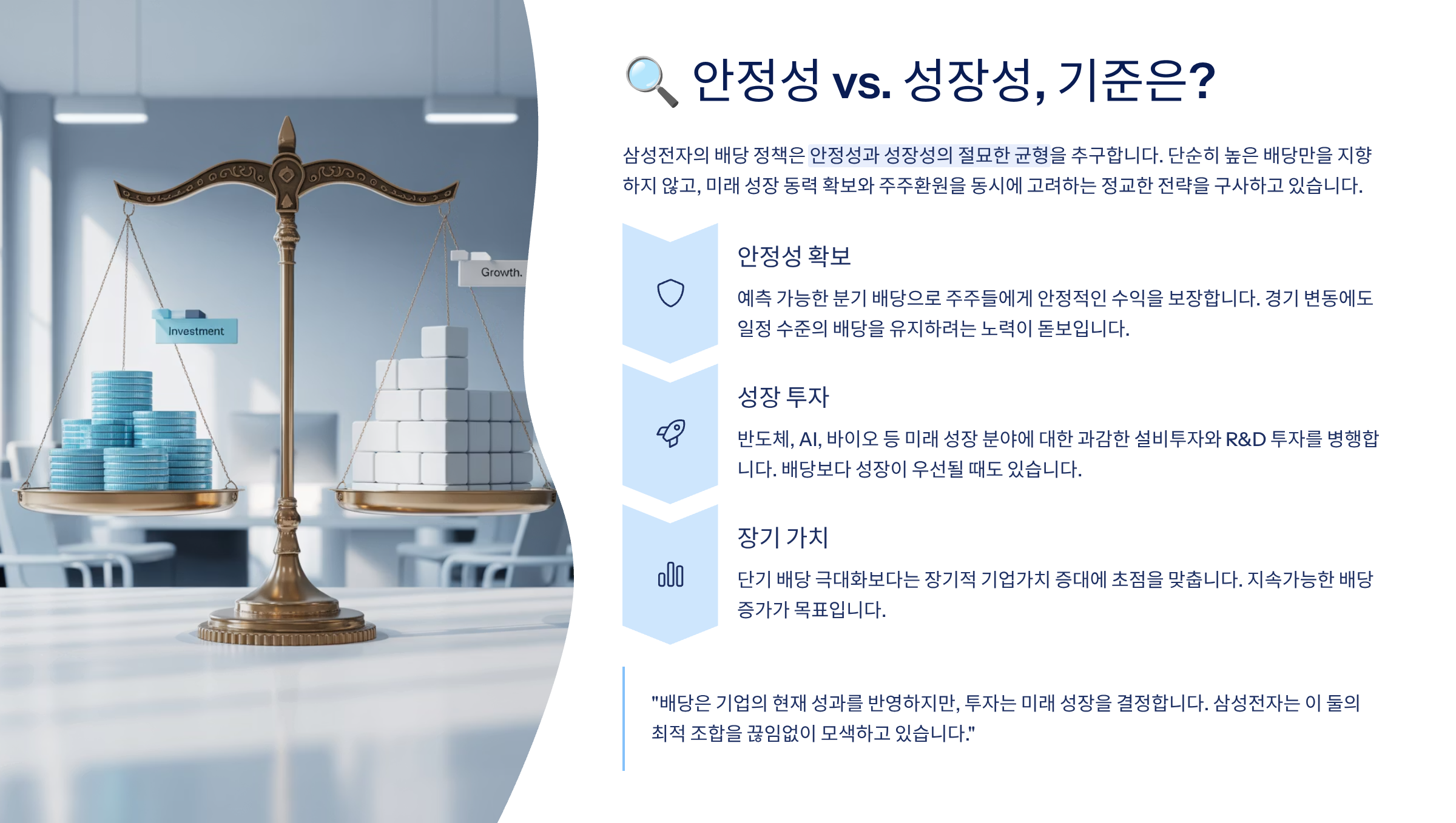 하지만 동시에 삼성전자는 투자 재원도 확보하고 있어요. 막대한 현금 유보로 반도체, 바이오, 인공지능 등 미래 성장동력에 투자를 아끼지 않죠. 즉, 배당과 투자를 균형 있게 병행하는 구조예요. ⚙️