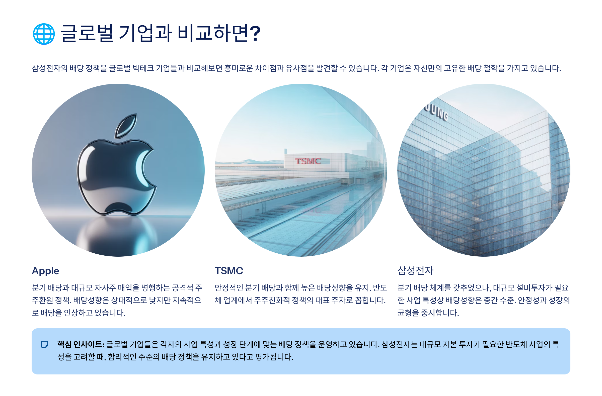삼성전자의 배당 정책은 애플, 마이크로소프트(MS), 인텔 같은 글로벌 IT 기업들과도 자주 비교돼요. 🧮