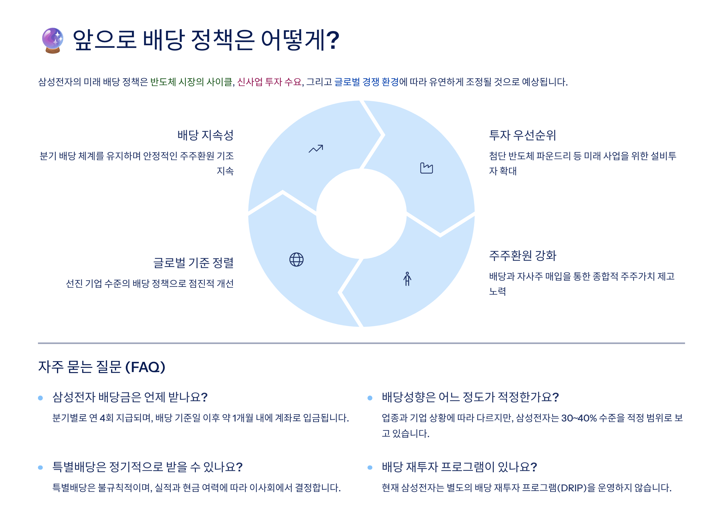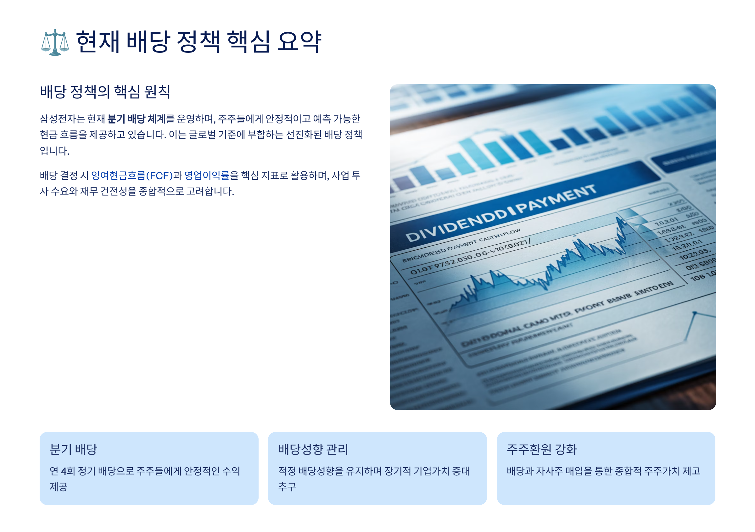 | 삼성전자 | 고정분기배당 + 자사주 소각 | 배당·소각·투자 균형 |