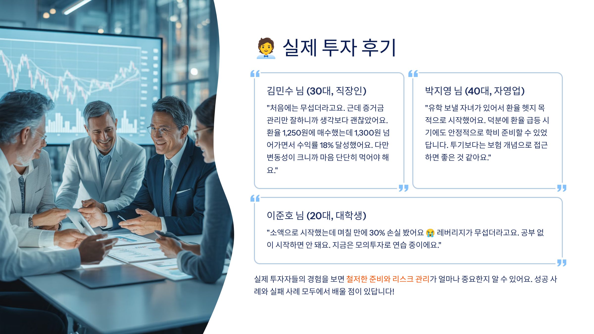 | A씨 (직장인) | +70만 원 수익 | 환율 예측 성공의 짜릿함 |