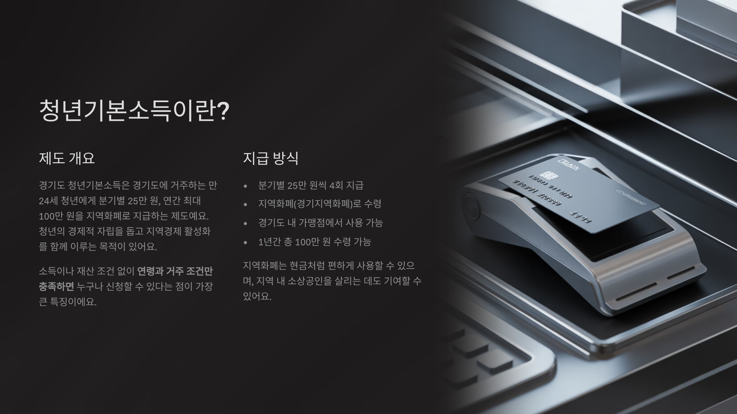 청년기본소득은 경기도에 거주하는 만 24세 청년에게 분기별 25만 원, 연간 최대 100만 원을 지역화폐로 지급하는 제도예요. 경제적 자립을 돕고, 지역경제를 살리는 목적도 함께 있어요.
