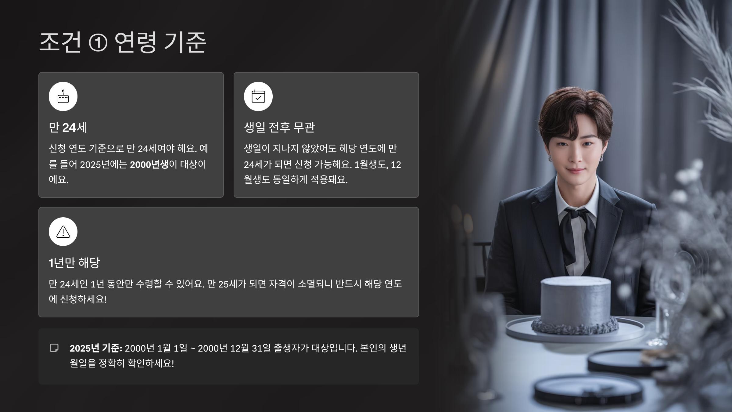 “생일 지나면 못 받나요?” 하는 질문이 많은데, 걱정 마세요! 신청한 날 기준으로 아직 만 24세라면 문제없어요. 생일은 크게 상관없어요. 🎂